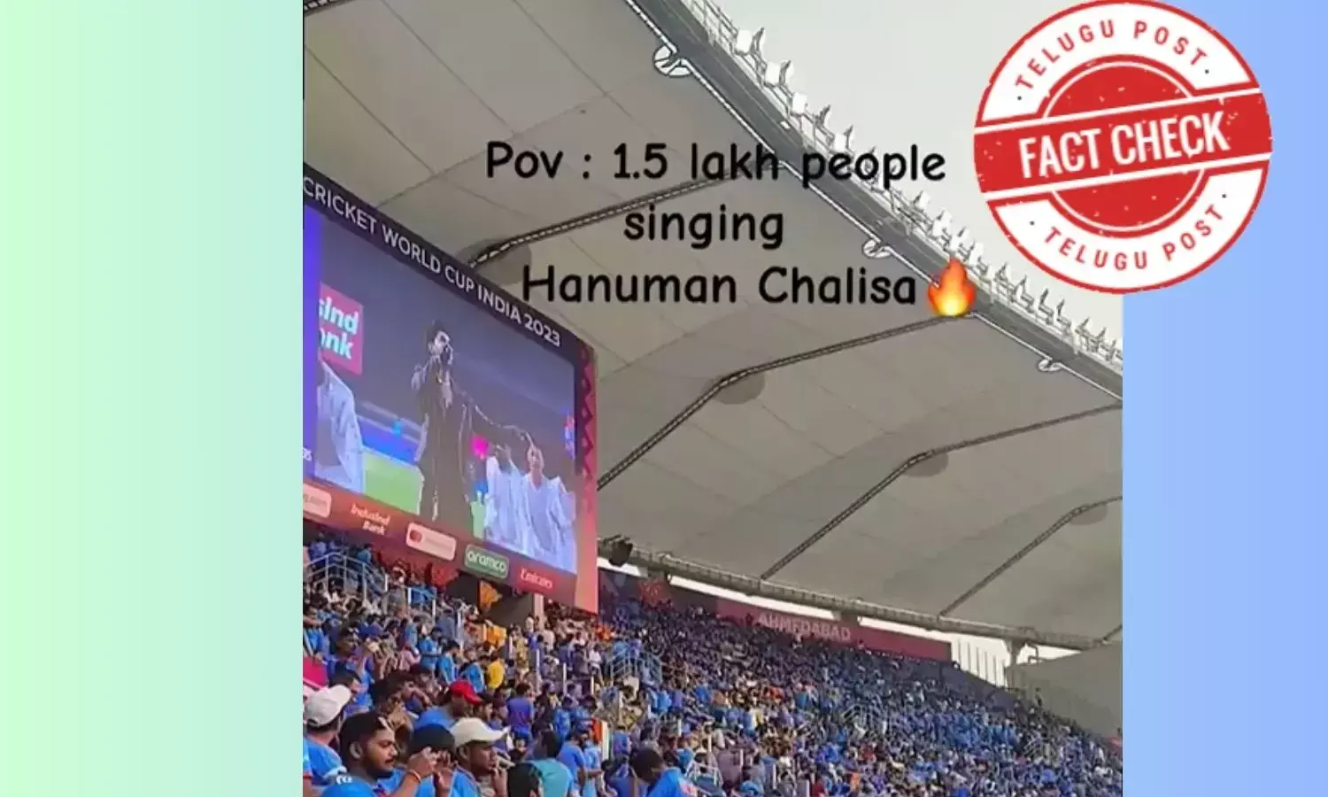 opindia ವೆಬ್ಸೈಟ್ನಲ್ಲಿ ಪ್ರಕಟವಾದ ವರದಿಯಲ್ಲಿ "ಐಸಿಸಿ ಕ್ರಿಕೆಟ್ ವಿಶ್ವಕಪ್ ಫೈನಲ್ಗೂ ಮುನ್ನ ನರೇಂದ್ರ ಮೋದಿ ಕ್ರೀಡಾಂಗಣದಲ್ಲಿ 1.3 ಲಕ್ಷ ಜನರು ಒಟ್ಟಾಗಿ ಹನುಮಾನ್ ಚಾಲೀಸವನ್ನು ಪಠಿಸಿದರು" ಎಂಬ ಶೀರ್ಷಿಕೆಯೊಂದಿಗೆ ಹಂಚಿಕೊಂಡಿದ್ದರು.