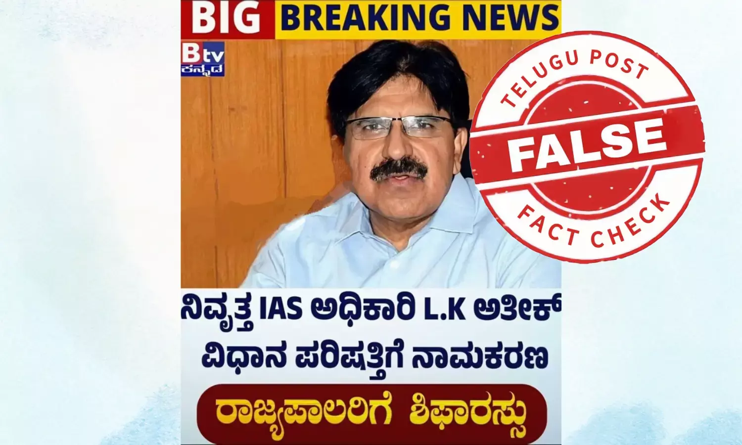 ಎಲ್.ಕೆ. ಅತೀಕ್ ವಿಧಾನ ಪರಿಷತ್ತಿಗೆ ನಾಮಕರಣ, ರಾಜ್ಯಪಾಲರಿಗೆ ಶಿಫಾರಸ್ಸು ಎಂದು ಸುಳ್ಳು ಸುದ್ದಿ ಹಂಚಿಕೆ