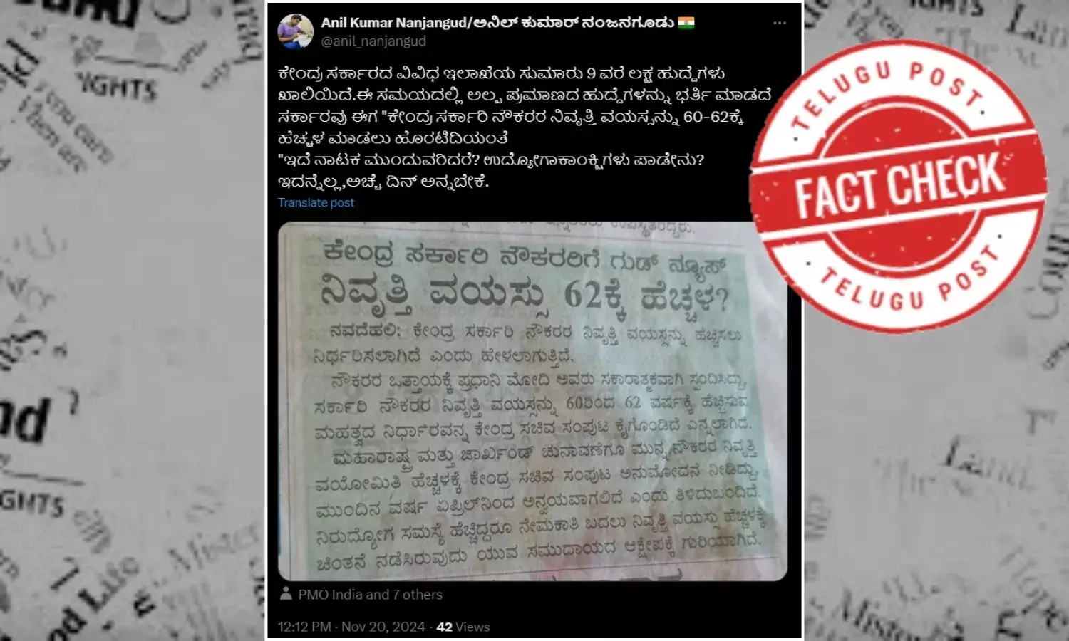 ನವಂಬರ್ 20,2024ರಂದು ʼಅನಿಲ್ ಕುಮಾರ್ ನಂಜನಗೂಡುʼ ಎಂಬ ಎಕ್ಸ್ ಖಾತೆದಾರ ತನ್ನ ಖಾತೆಯಲ್ಲಿ ನ್ಯೂಸ್ ಪೇಪರ್ನ ಕ್ಲಿಪ್ಪಿಂಗನ್ನು ಹಂಚಿಕೊಂಡು ʼಕೇಂದ್ರ ಸರ್ಕಾರದ ವಿವಿಧ ಇಲಾಖೆಯ ಸುಮಾರು 9 ವರೆ ಲಕ್ಷ ಹುದ್ದೆಗಳು ಖಾಲಿಯಿದೆ.ಈ ಸಮಯದಲ್ಲಿ ಅಲ್ಪ ಪ್ರಮಾಣದ ಹುದ್ದೆಗಳನ್ನು ಭರ್ತಿ ಮಾಡದೆ ಸರ್ಕಾರವು ಈಗ "ಕೇಂದ್ರ ಸರ್ಕಾರಿ ನೌಕರರ ನಿವೃತ್ತಿ ವಯಸ್ಸನ್ನು 60-62ಕ್ಕೆ ಹೆಚ್ಚಳ ಮಾಡಲು ಹೊರಟಿದಿಯಂತೆ "ಇದೆ ನಾಟಕ ಮುಂದುವರಿದರೆ? ಉದ್ಯೋಗಾಕಾಂಕ್ಷಿಗಳು ಪಾಡೇನು?ಇದನ್ನೆಲ್ಲ,ಅಚ್ಚೆ ದಿನ್ ಅನ್ನಬೇಕೆ.ʼ ಎಂಬ ಶೀರ್ಷಿಕೆಯೊಂದಿಗೆ ಚಿತ್ರವನ್ನು ಹಂಚಿಕೊಂಡಿದ್ದಾರೆ