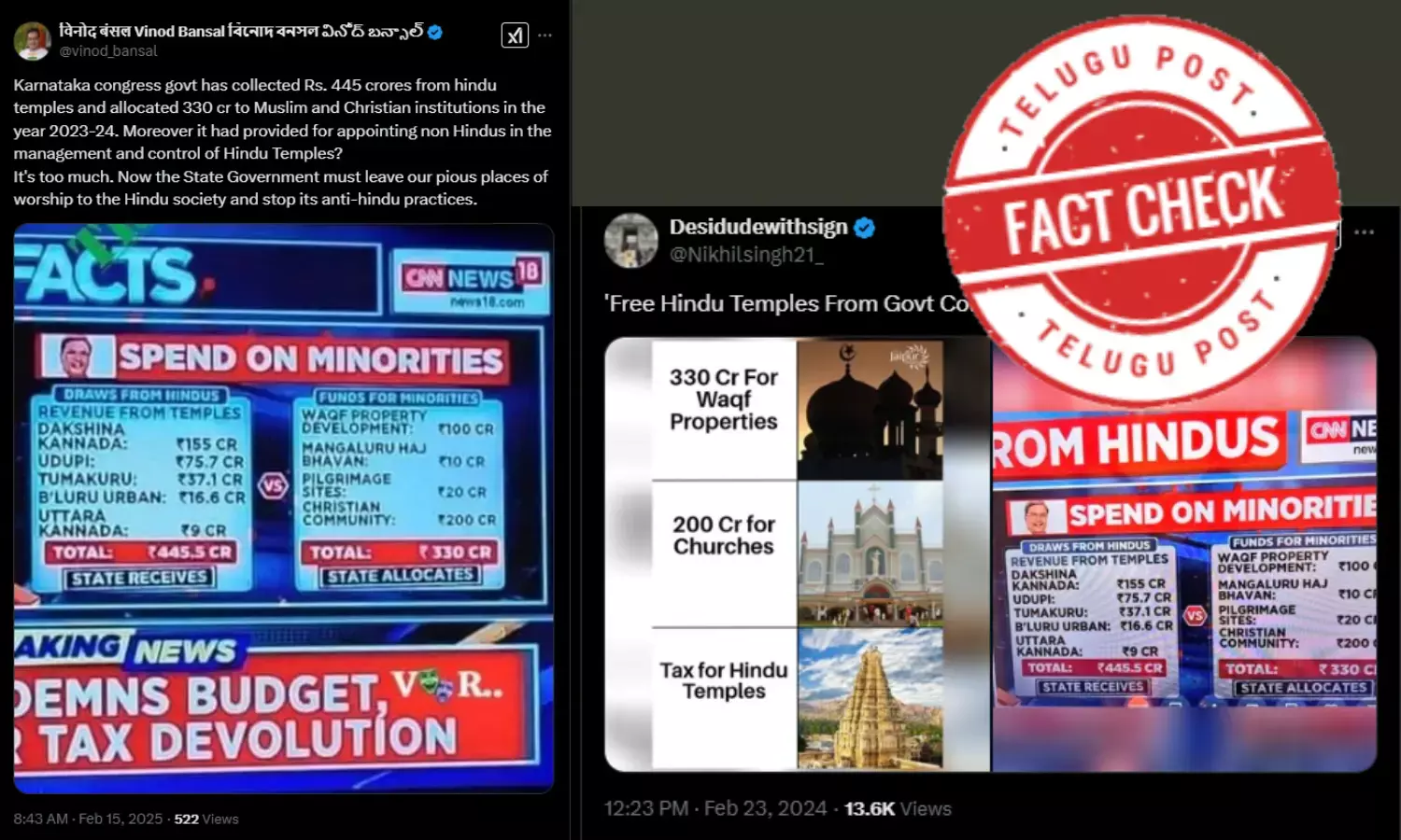 ವಿನೋದ್ ಬನ್ಸಾಲ್ ಎಂಬ ಎಕ್ಸ್ ಖಾತೆದಾರ ಫೆಬ್ರವರಿ 15, 2025ರಂದು ʼKarnataka congress govt has collected Rs. 445 crores from hindu temples and allocated 330 cr to Muslim and Christian institutions in the year 2023-24. Moreover it had provided for appointing non Hindus in the management and control of Hindu Temples? It's too much. Now the State Government must leave our pious places of worship to the Hindu society and stop its anti-hindu practicesʼ ಎಂಬ ಶೀರ್ಷಿಕೆಯೊಂದಿಗೆ ʼಸಿಎನ್ಎನ್ ನ್ಯೂಸ್ 18ʼ ಚಾನೆಲ್ನಲ್ಲಿ ಬಂದಂತಹ ಚಿತ್ರವನ್ನು ಹಂಚಿಕೊಂಡಿರುವುದನ್ನು ನೋಡಬಹುದು. ಶೀರ್ಷಿಕೆಯನ್ನು ಕನ್ನಡಕ್ಕೆ ಅನುವಾದಿಸಿದಾಗ ʼಕರ್ನಾಟಕ ಕಾಂಗ್ರೆಸ್ ಸರ್ಕಾರವು ರೂ. 2023-24ನೇ ಸಾಲಿನಲ್ಲಿ ಹಿಂದೂ ದೇವಾಲಯಗಳಿಂದ 445 ಕೋಟಿ ರೂ. ಮತ್ತು ಮುಸ್ಲಿಂ ಮತ್ತು ಕ್ರಿಶ್ಚಿಯನ್ ಸಂಸ್ಥೆಗಳಿಗೆ 330 ಕೋಟಿ ರೂ. ಹಂಚಿಕೆ ಮಾಡಲಾಗಿದೆ. ಇದಲ್ಲದೆ ಹಿಂದೂ ದೇವಾಲಯಗಳ ನಿರ್ವಹಣೆ ಮತ್ತು ನಿಯಂತ್ರಣದಲ್ಲಿ ಹಿಂದೂಯೇತರರನ್ನು ನೇಮಿಸಿಕೊಳ್ಳಲು ಅವಕಾಶ ನೀಡಲಾಗಿತ್ತು? ಇದು ತುಂಬಾ ಹೆಚ್ಚು. ಈಗ ರಾಜ್ಯ ಸರ್ಕಾರವು ನಮ್ಮ ಧಾರ್ಮಿಕ ಪೂಜಾ ಸ್ಥಳಗಳನ್ನು ಹಿಂದೂ ಸಮಾಜಕ್ಕೆ ಬಿಟ್ಟುಕೊಡಬೇಕು ಮತ್ತು ಅದರ ಹಿಂದೂ ವಿರೋಧಿ ಆಚರಣೆಗಳನ್ನು ನಿಲ್ಲಿಸಬೇಕು.ʼ ಎಂಬ ಶೀರ್ಷಿಕೆಯನ್ನೀಡಿರುವುದನ್ನು ನೋಡಬಹುದು.