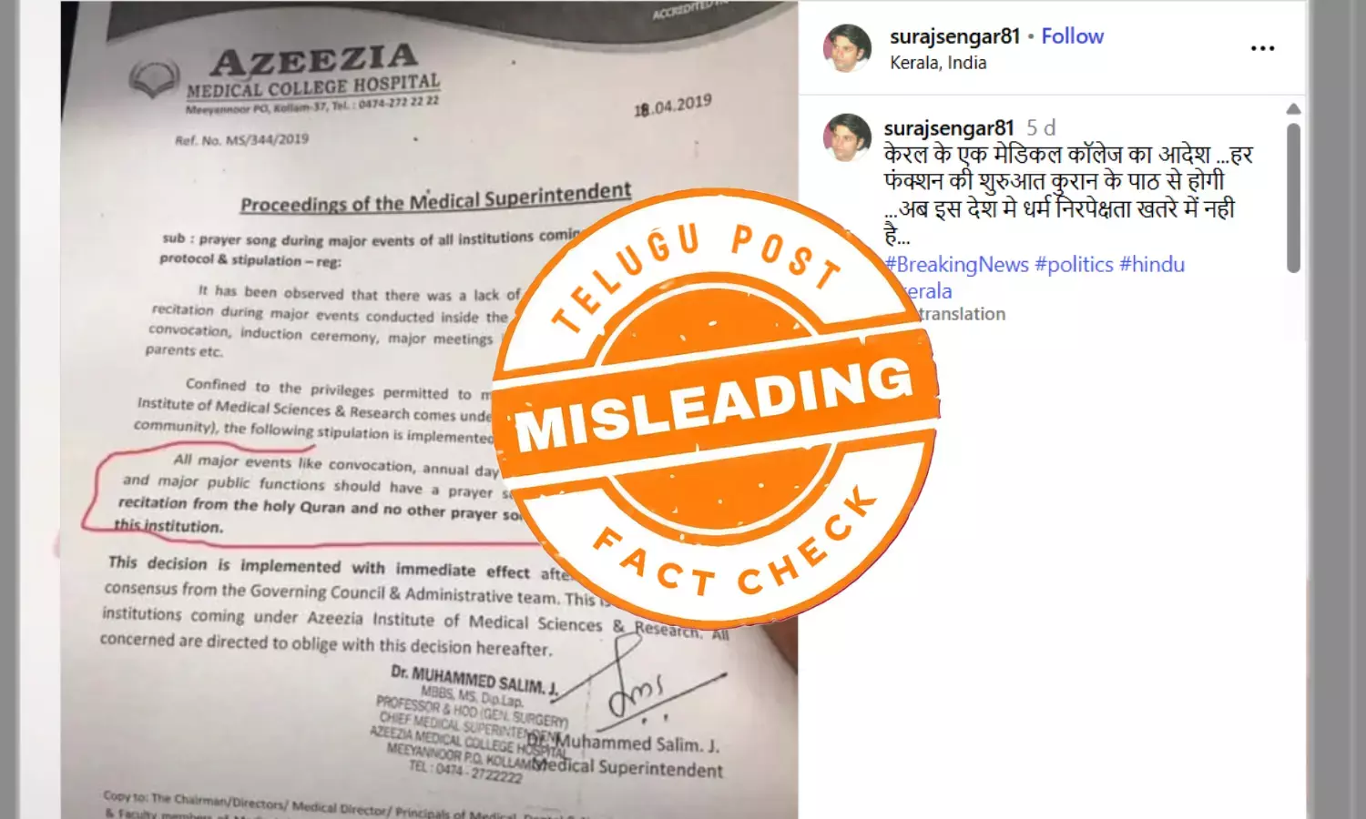 ಇತ್ತೀಚಿಗೆ ಸಾಮಾಜಿಕ ಜಾಲತಾಣದಲ್ಲಿ ಕೇರಳಾಗೆ ಸಂಬಂಧಿಸಿದ ಸುದ್ದಿಯೊಂದು ವೈರಲ್ ಆಗುತ್ತಿದೆ. ಕೇರಳದ ಒಂದು ವೈದ್ಯಕೀಯ ಕಾಲೇಜು ತನ್ನ ಎಲ್ಲಾ ಪ್ರಮುಖ ಕಾರ್ಯಕ್ರಮಗಳಿಗೆ ಮೊದಲು ಕುರಾನ್ ಓದುವುದನ್ನು ಕಡ್ಡಾಯಗೊಳಿಸಿದೆ ಎಂಬ ಆ ಪತ್ರದಲ್ಲಿ ಉಲ್ಲೇಖಿಸಿರವುದನ್ನು ನೋಡಬಹುದು. ಈ ಸುದ್ದಿಯಿಂದ ಕೆಲವರು ಈ ನಿರ್ಧಾರವು ದೇಶದ ಏಕತೆಗೆ ಧಕ್ಕೆ ತರುತ್ತದೆ ಎಂದು ಆರೋಪಿಸಿದ್ದಾರೆ. ಈ ವೈರಲ್ ಪೋಸ್ಟ್ಗಳು ಜನರನ್ನು ದಾರಿತಪ್ಪಿಸುವ ಮೂಲಕ ಧಾರ್ಮಿಕ ಸಾಮರಸ್ಯವನ್ನು ಕದಡುವಂತೆ ಮಾಡಿದೆ