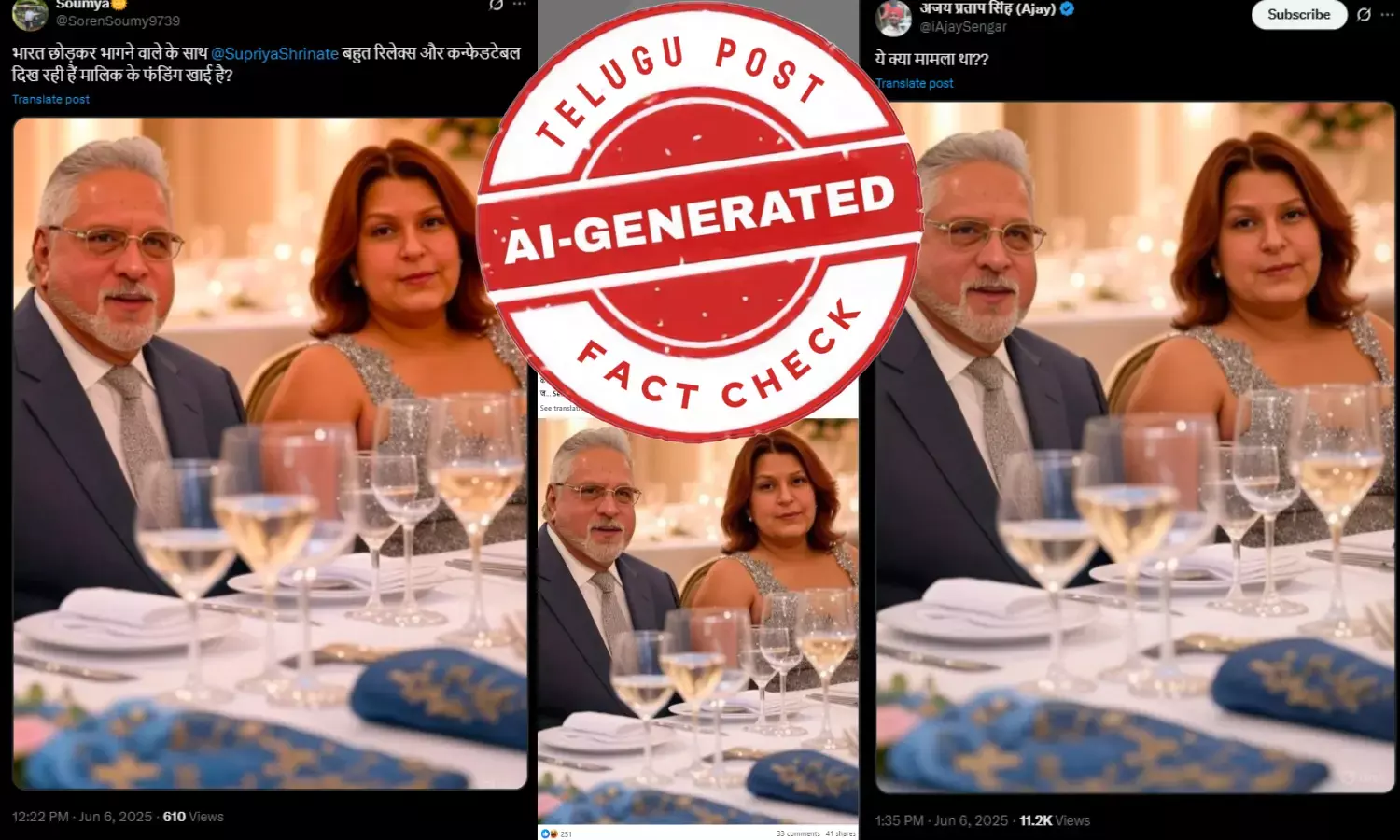 ವೈರಲ್ ಆದ ಸುದ್ದಿಯಲ್ಲಿ ಯಾವುದೇ ಸತ್ಯಾಂಶವಿಲ್ಲ. ವಿಜಯ್ ಮಲ್ಯ ಮತ್ತು ಸುಪ್ರಿಯಾ ಶ್ರೀನೇಟ್ ಒಟ್ಟಿಗೆ ಕುಳಿತಿರುವ ಫೋಟೋವನ್ನು ಎಐ ಬಳಸಿ ರಚಿಸಲಾಗಿದೆ.