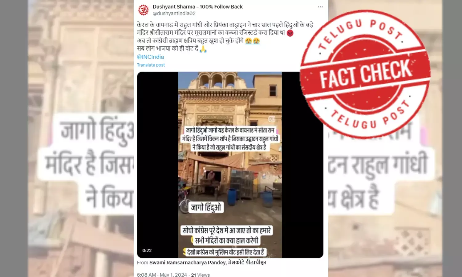 ವಿಡಿಯೋವನ್ನು ಹಂಚಿಕೊಂಡು ಹಿಂದಿಯಲ್ಲಿ ಶೀರ್ಷಿಕೆಯಾಗಿ “केरल के वायनाड में राहुल गांधी और प्रियंका वाड्राइन ने चार साल पहले हिंदुओं के बड़े मंदिर श्रीसीताराम मंदिर पर मुसलमानों का कब्जा रजिस्टर्ड करा दिया था अब तो कांग्रेसी ब्राह्मण क्षत्रिय बहुत खुश हो चुके होंगे, सब लोग भाजपा को ही वोट दें “,