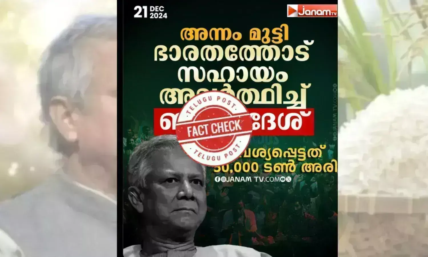 ഈ പശ്ചാത്തലത്തിലാണ് ഇന്ത്യയോട് ബംഗ്ലാദേശ് 50000 ടൺ അരിക്കായി അഭ്യർഥിച്ചെന്ന് സാമൂഹ്യ മാധ്യമങ്ങളിൽ പ്രചരിക്കുന്നത്. അന്നം മുട്ടി ഭാരതത്തോട് സഹായം അഭ്യർഥിച്ച് ബംഗ്ലാദേശ് എന്നാണ് ജനം ടിവിയുടെ പോസ്റ്റ്. പോസ്റ്റും ലിങ്കും ചുവടെ.
