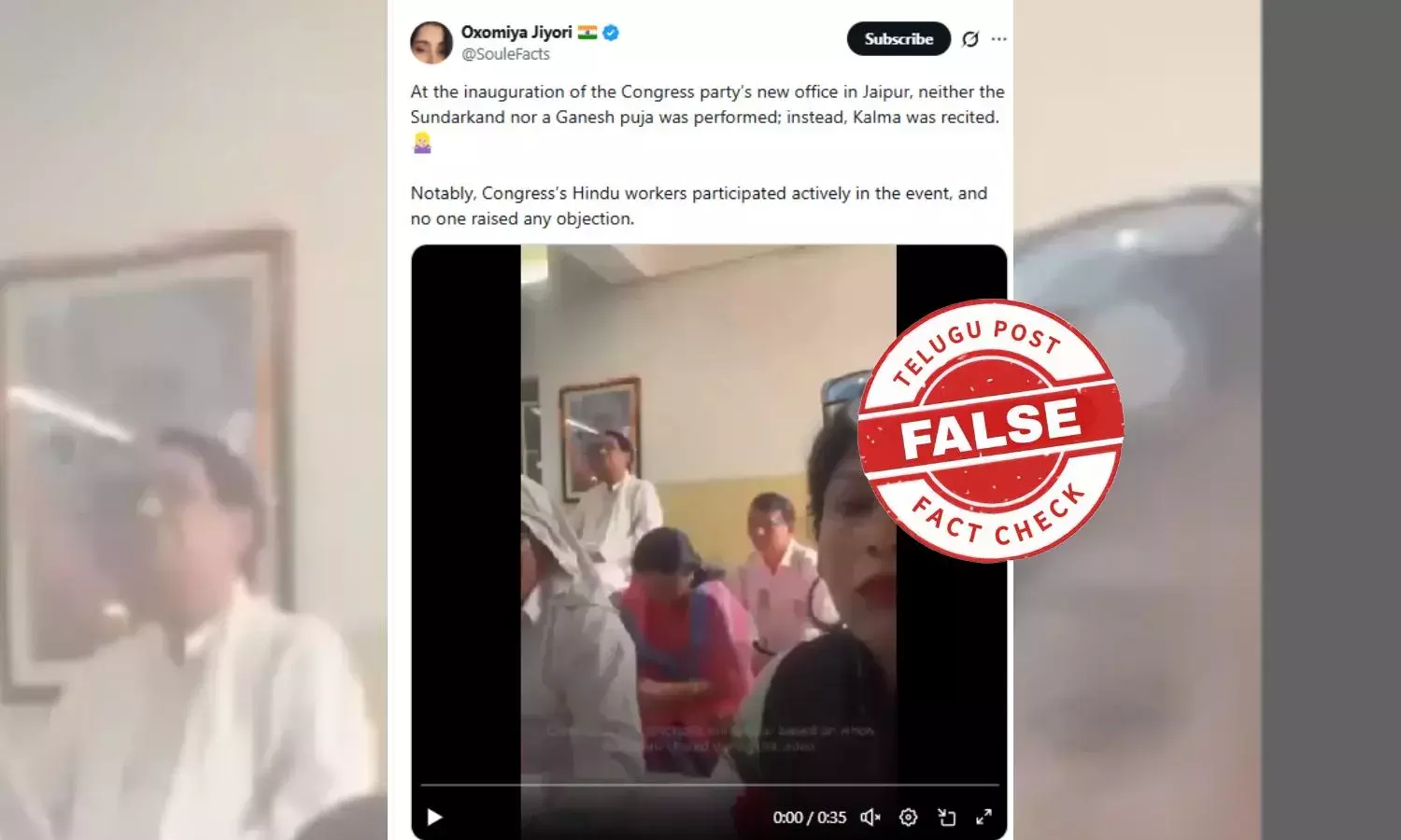 "ജയ്പൂരിലെ കോൺഗ്രസ് പാർട്ടിയുടെ പുതിയ ഓഫീസിൻ്റെ ഉദ്ഘാടന വേളയിൽ സുന്ദരകാണ്ഡമോ ഗണേശ പൂജയോ നടത്തിയില്ല; പകരം, കലിമ ചൊല്ലുകയായിരുന്നു.കോൺഗ്രസിൻ്റെ ഹിന്ദു പ്രവർത്തകർ പരിപാടിയിൽ സജീവമായി പങ്കെടുത്തെന്നത് ശ്രദ്ധേയമാണ്. ആരും ഒരു എതിർപ്പും ഉന്നയിച്ചില്ല" എന്ന അടിക്കുറിപ്പോടെയാണ് വീഡിയോ എക്സിൽ പ്രചരിക്കുന്നത്. പോസ്റ്റും ലിങ്കും ചുവടെ.