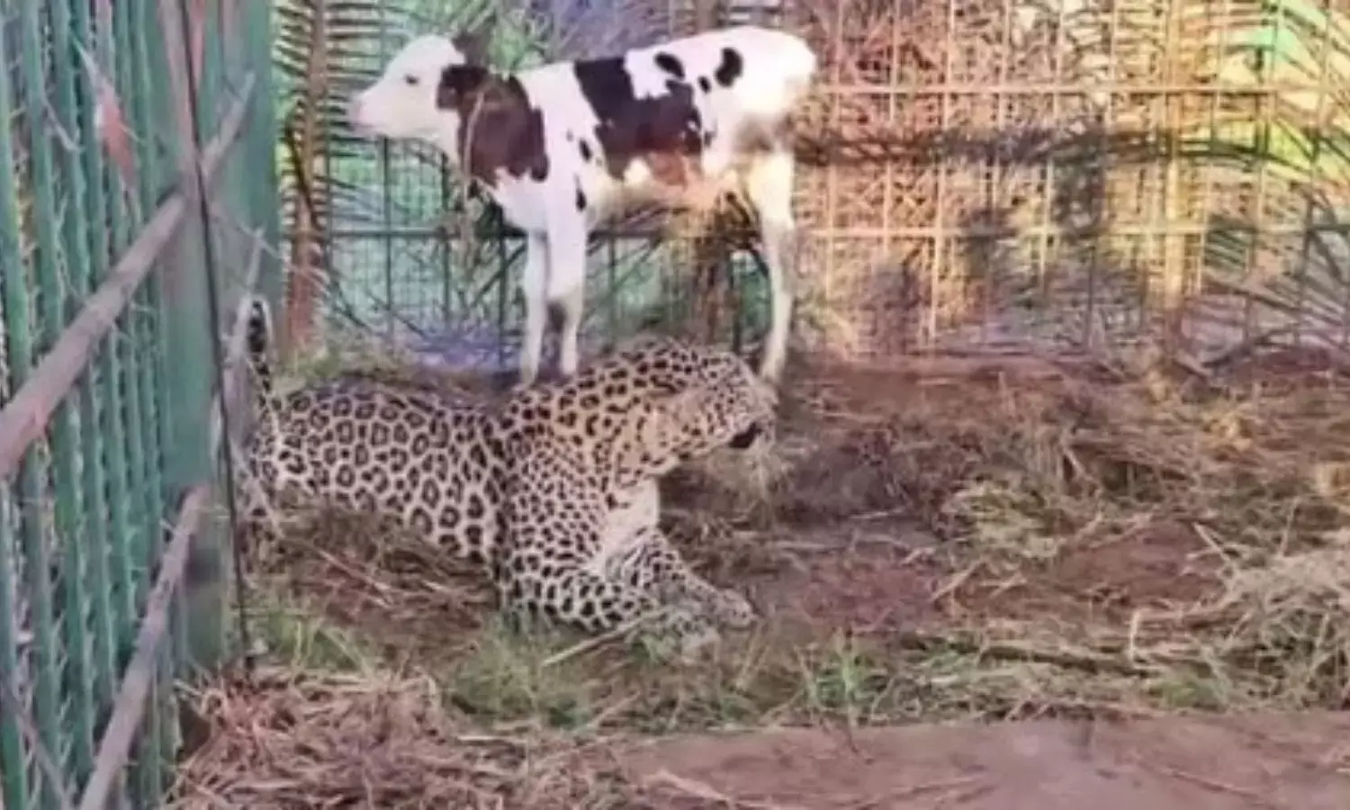 కర్ణాటకలోని మైసూరు జిల్లా హెగ్గడదేవనకోటె శివార్లలో చిరుత సంచరిస్తోందని ఫిర్యాదులు వచ్చాయి. దీంతో అటవీ శాఖ అధికారులు ఓ బోను ఏర్పాటు చేశారు. ఎరగా ఒక లేగ దూడను అందులో పెట్టారు. ఆహారాన్ని వెతుక్కుంటూ వచ్చిన చిరుత ఆ బోనులో పడింది. అయితే చిరుత ఆ దూడను తినకుండా అక్కడే పక్కన కూర్చుంది. అటవీ సిబ్బంది ఉదయాన వచ్చి చూడగా లేగ దూడ చిరుత పక్కనే కూర్చుని గడ్డి తినడాన్ని చూసి ఆశ్చర్యపోయారు. దూడను బయటకు తీసి, మత్తు మందు సాయంతో చిరుతను బంధించి తీసుకువెళ్లారు. దూడను తినకుండా చిరుత ఎందుకో మనసు మార్చుకోవడం విశేషం.