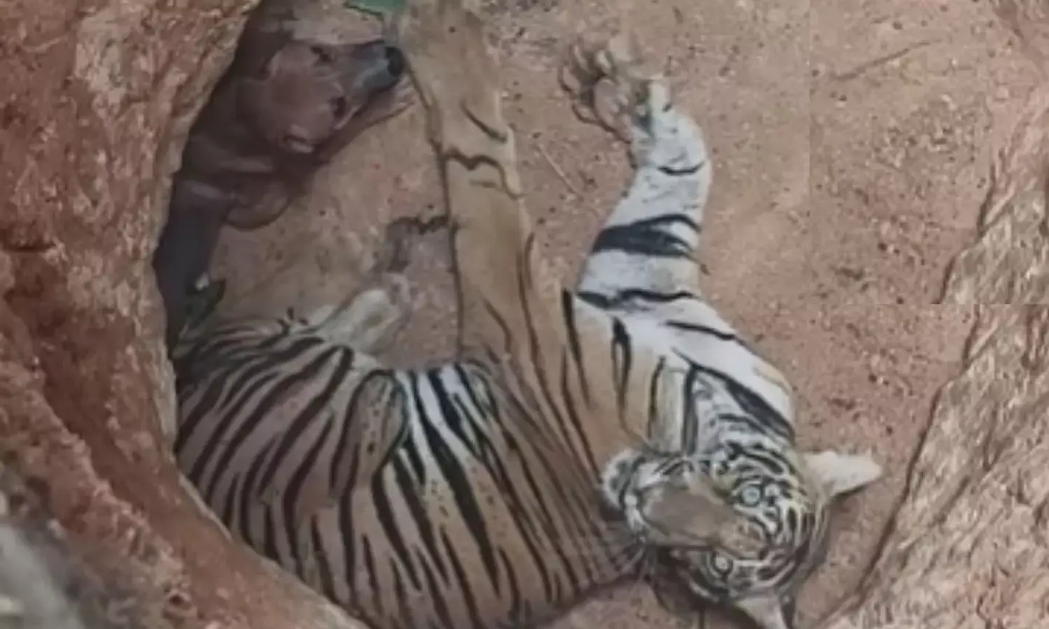 గుంతలో కుక్క-పులి.. ఎక్కడి నుండి వచ్చాయంటే?