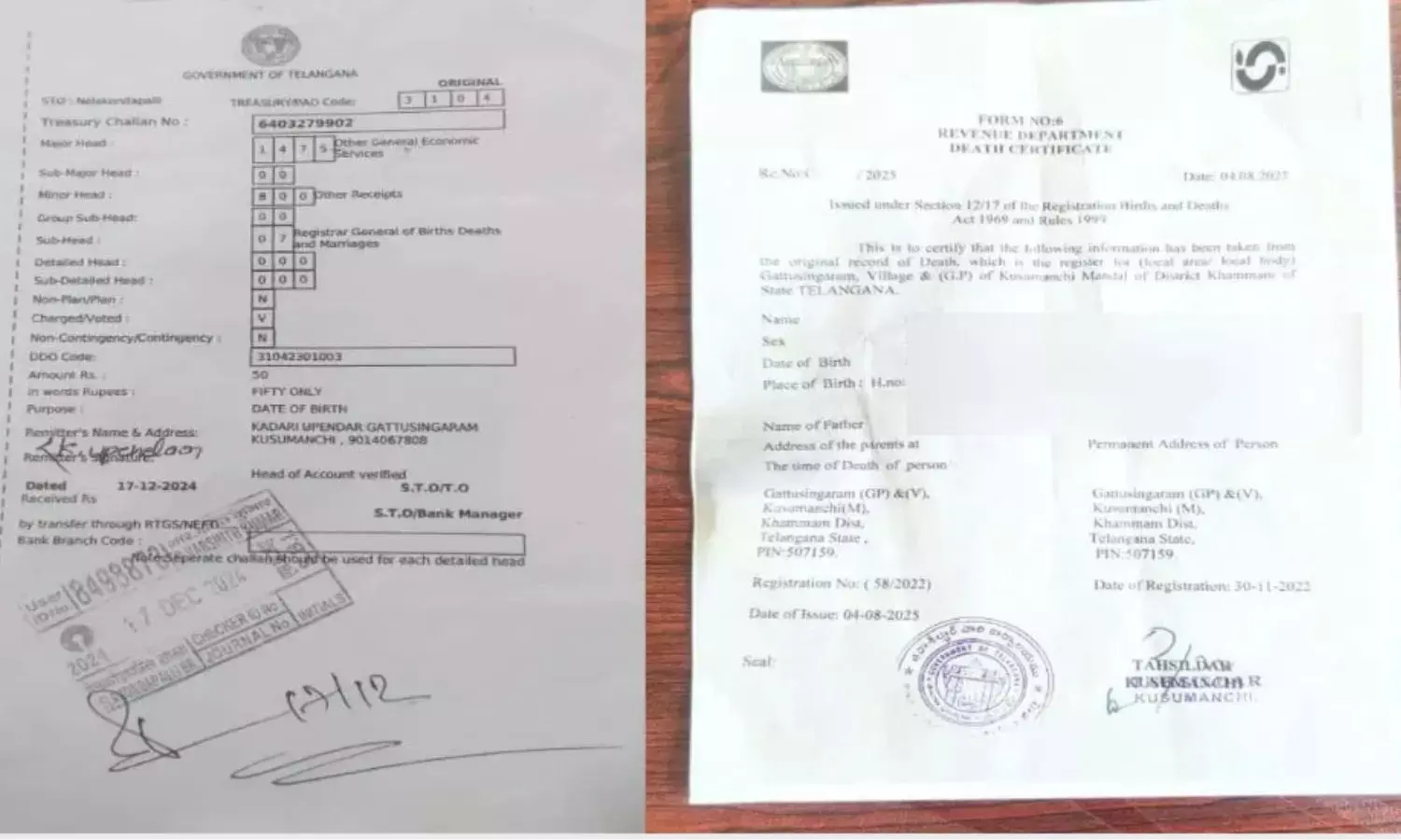బర్త్ సర్టిఫికెట్ అడిగితే డెత్ సర్టిఫికెట్ ఇచ్చారు. ఈ ఘటన కూసుమంచి తహసీల్దార్ కార్యాలయంలో చోటు చేసుకుంది. గట్టుసింగారం గ్రామానికి చెందిన కడారి విద్య అనే బాలిక తల్లిదండ్రులు బర్త్ సర్టిఫికెట్ కోసం పుట్టిన ఆరు నెలల తరువాత దరఖాస్తు చేసుకున్నారు. పంచాయతీలో రికార్డులు లేకపోవడంతో తహసీల్దార్ కార్యాలయంలో దరఖాస్తు చేసుకోమని పంచాయతీ కార్యదర్శి చెప్పారు. దీంతో బర్త్ సర్టిఫికెట్ కోసం తహసీల్దార్ కార్యాలయంలో దరఖాస్తు చేశారు. ఆగస్టు 4 వ తేది బర్త్ సర్టిఫికెట్ కోసం కార్యాలయానికి వెళ్లగా బర్త్ సర్టిఫికెట్ తహసీల్దార్ కార్యాలయం ముద్ర వేసి ఇచ్చారు. బాలిక తల్లి మమత సర్టిఫికెట్ ను ఫొటో తీసుకుంది. అయితే నిశితంగా పరిశీలించగా బర్త్ సర్టిఫికెట్ బదులు డెత్ సర్టిఫికెట్ ఇచ్చినట్లు ఉంది. బాలిక తల్లి అధికారిని ప్రశ్నించగా లాక్కొని చించేశారు. మళ్లీ బర్త్ సర్టిఫికెట్ అందించాడు. అందులో ఎక్కడ కూడా డెలివరీ వివరాలు నమోదు చేయలేదు.