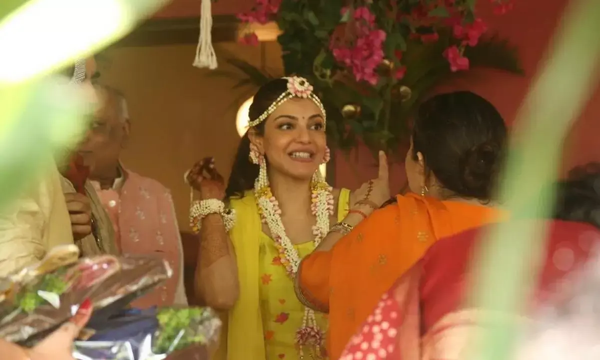 టాలీవుడ్ చందమామ కాజల్ అగర్వాల్ నేడు పెళ్లి పీటలెక్కబోతుంది. గుట్టు చప్పుడు కాకుండా నిశ్చితార్ధం చేసుకున్న కాజల్ అగర్వాల్ పెళ్లి విషయం చాలా సైలెంట్ గా బయట పెట్టింది. నేడు పెళ్లి పీటలేక్కబోతున్న కాజల్ పెళ్లి వేడుకలు గత మూడు రోజులుగా సోషల్ మీడియాలో తెగ వైరలవుతున్నాయి. కాజల్ మెహిందీ ఫంక్షన్, సంగీత్ ఫంక్షన్, పసుపు ఫంక్షన్, కాజల్ డాన్స్ వీడియోస్ ఒకొక్కటిగా సోషల్ మీడియాలో షేర్ అవుతున్నాయి. చాలా సింపుల్ గా కుటుంబ సభ్యుల మధ్య పెళ్లి కూతురురిగా పెళ్లి పీటలెక్కుతున్న కాజల్ అగర్వాల్ రిసెప్షన్ కూడా గ్రాండ్ గా చేసుకోలేకపోతుంది. కారణం కరోనా కరోనా కరోనా..