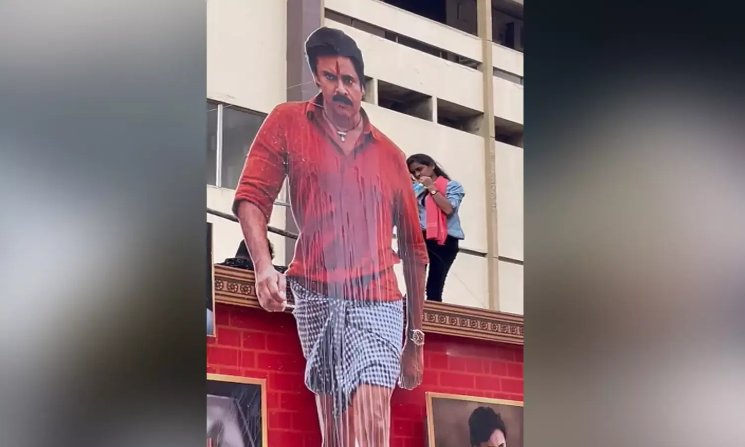పవన్ కల్యాణ్ లేడీ ఫ్యాన్ హంగామా.. కటౌట్ పైకి ఎక్కి..