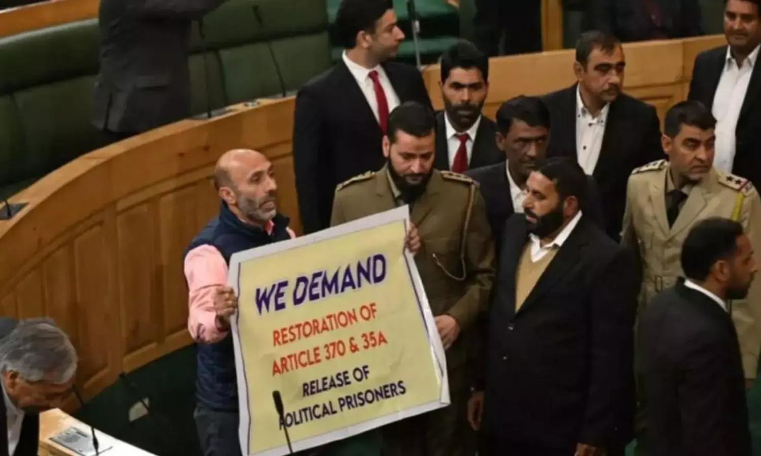 2019లో తొలగించిన 370, 32ఎ ను పునరుద్ధరించాలని పీడీపీ అసెంబ్లీలో తీర్మానం ప్రవేశం పెట్టింది. మరోవైపు ప్రత్యేక రాష్ట్ర హోదాను జమ్మూ కాశ్మీర్ కు ఇవ్వాలని కోరుతుంది. దీంతో ఇరు వర్గాల మధ్య తోపులాట జరిగింది. మార్షల్స్ వచ్చి ఆందోళన చేస్తున్న ఎమ్మెల్యేలను అదుపులోకి తీసుకుంటున్నారు.