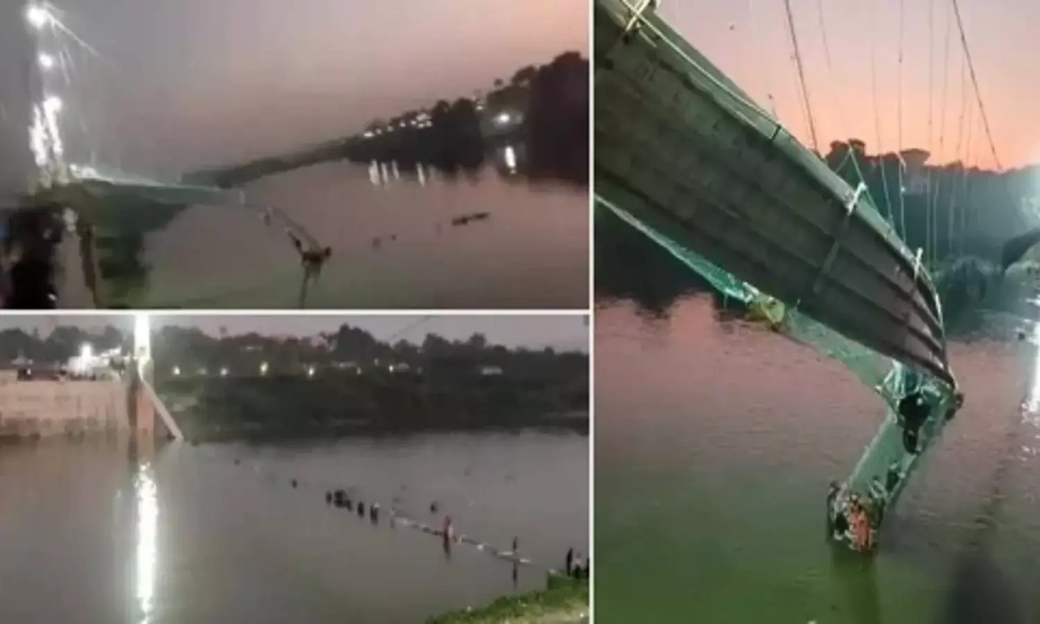 గుజరాత్ వంతెన విషాదం: గుజరాత్ వంతెన కూలిపోవడంలో మృతుల సంఖ్య 130కి చేరుకుంది, ఇప్పటివరకు 177 మంది రక్షించారు. మోర్బీ ప్రాంతంలో మచ్చునదిపై ఉన్న కేబుల్ బ్రిడ్జి కూలిపోవడంతో.. నదిలో 400 మందికి పైగా గల్లంతయ్యారు. ఆదివారం ఈ ఘటన జరిగింది. బ్రిడ్జి ఉన్నట్టుండి కూలిపోవడంతో.. దానిపై ప్రయాణిస్తున్న వారంతా అమాంతం నదిలో పడిపోయారు. ఈ ప్రమాదంలో ఏడుగురు మృతి చెందినట్లు తెలుస్తోంది. మృతుల సంఖ్య మరింత పెరిగే అవకాశం ఉందని పోలీసులు చెబుతున్నారు. ఘటనపై సమాచారం అందుకున్న పౌర, పోలీసు ఉన్నతాధికారులు ఘటనా స్థలానికి చేరుకుని సహాయక చర్యలు చేపట్టారు. గల్లంతైన వారి కోసం కుటుంబ సభ్యుల రోదనలు మిన్నంటాయి.