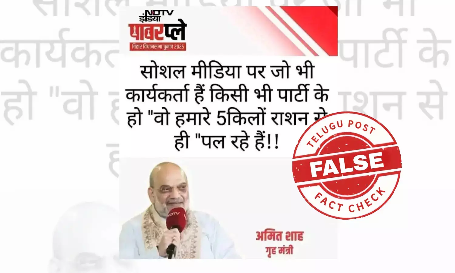 ଇତିମଧ୍ୟରେ ଏକ ଗ୍ରାଫିକ୍ସ ସୋସିଆଲ ମିଡିଆରେ ଭାଇରାଲ ହେବାରେ ଲାଗିଛି । ଭାଇରାଲ ଗ୍ରାଫିକ୍ସର ଗୋଟିଏ ପାର୍ଶ୍ଵରେ କେନ୍ଦ୍ର ଗୃହମନ୍ତ୍ରୀ ଅମିତ ଶାହାଙ୍କ ଫଟୋ ଲାଗିଥିବା ଵେଳେ ସାହାଙ୍କ ଫଟୋ ଉପରେ ଲେଖା ହୋଇଛି, ସୋସିଆଲ ମିଡିଆରେ ଯେତେବି କାର୍ଯ୍ୟକର୍ତା ଅଛନ୍ତି ଯେ କୌଣସି ପାର୍ଟିର ହୁଅନ୍ତୁ ନାଁ କାହିଁକି । ସିଏ ଆମର ୫କେଜି ରାସନରୁ ଚଳୁଛନ୍ତି । ଏହା ଅମିତ ସାହାଙ୍କ ମତ ବୋଲି ଦାବି କରିଛନ୍ତି ୟୁଜର୍ସ । ଅନ୍ୟପଟେ ଗ୍ରାଫିକ୍ସର ଉପର ପାର୍ଶ୍ଵରେ ଏନଡିଟିଭି ପାୱାରପ୍ଲେ ଉଲ୍ଲେଖ ରହିଛି ।