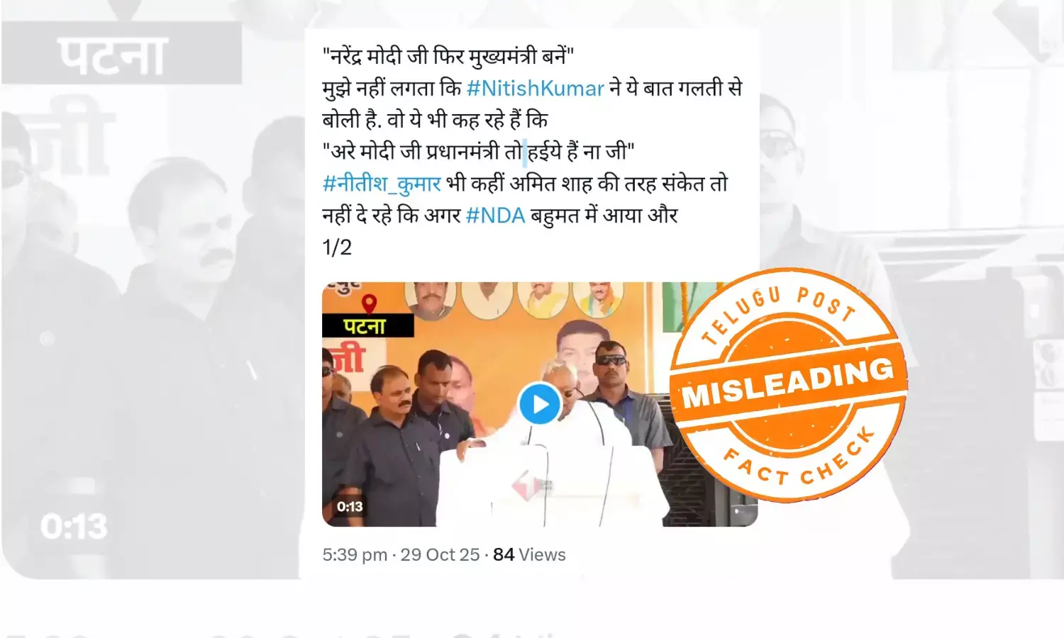 ଦାବିଟି ବିଭ୍ରାନ୍ତିକର ଅଟେ । ଭିଡିଓଟିର ଚଳିତବର୍ଷ ହେବାକୁଥିବା ବିହାର ନିର୍ବାଚନ ସହ କୌଣସି ସାମଞ୍ଜସ୍ୟ ନାହିଁ । ନୀତିଶ କୁମାର ଏହା କହିଛନ୍ତି ସତ ହେଲେ ପରେପରେ ଏହାକୁ ସୁଧାରି ମଧ୍ୟ ଦେଇଛନ୍ତି ।
