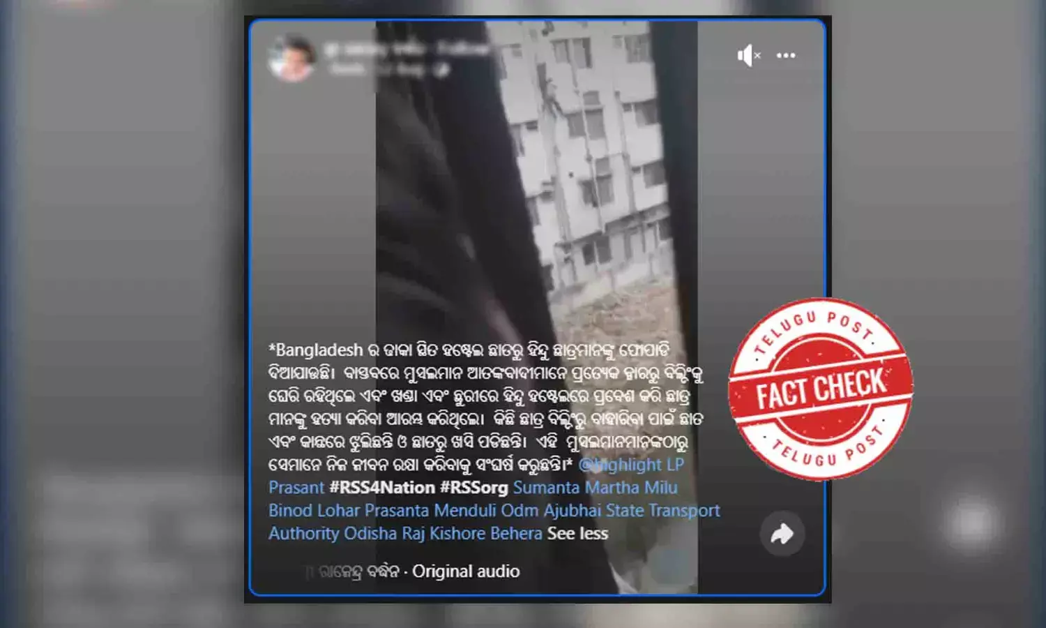 ସୋସିଆଲ ମିଡିଆରେ ୟୁଜର୍ସ କିଛି କ୍ୟାପସନ ଲେଖି ଭିଡିଓ ଟିକୁ ସେୟାର କରୁଥିବାର ଦେଖା ଯାଇଛି, କ୍ୟାପସନ ଅନୁଯାୟୀ "*Bangladesh ର ଢାକା ସ୍ଥିତ ହଷ୍ଟେଲ ଛାତରୁ ହିନ୍ଦୁ ଛାତ୍ରମାନଙ୍କୁ ଫୋପାଡି ଦିଆଯାଉଛି। ବାସ୍ତବରେ ମୁସଲମାନ ଆତଙ୍କବାଦୀମାନେ ପ୍ରତ୍ୟେକ ଦ୍ୱାରରୁ ବିଲ୍ଡିଂକୁ ଘେରି ରହିଥିଲେ ଏବଂ ଖଣ୍ଡା ଏବଂ ଛୁରୀରେ ହିନ୍ଦୁ ହଷ୍ଟେଲରେ ପ୍ରବେଶ କରି ଛାତ୍ର ମାନଙ୍କୁ ହତ୍ୟା କରିବା ଆରମ୍ଭ କରିଥିଲେ। କିଛି ଛାତ୍ର ବିଲ୍ଡିଂରୁ ବାହାରିବା ପାଇଁ ଛାତ ଏବଂ କାନ୍ଥରେ ଝୁଲିଛନ୍ତି ଓ ଛାତରୁ ଖସି ପଡିଛନ୍ତି। ଏହି ମୁସଲମାନମାନଙ୍କଠାରୁ ସେମାନେ ନିଜ ଜୀବନ ରକ୍ଷା କରିବାକୁ ସଂଘର୍ଷ କରୁଛନ୍ତି" ।