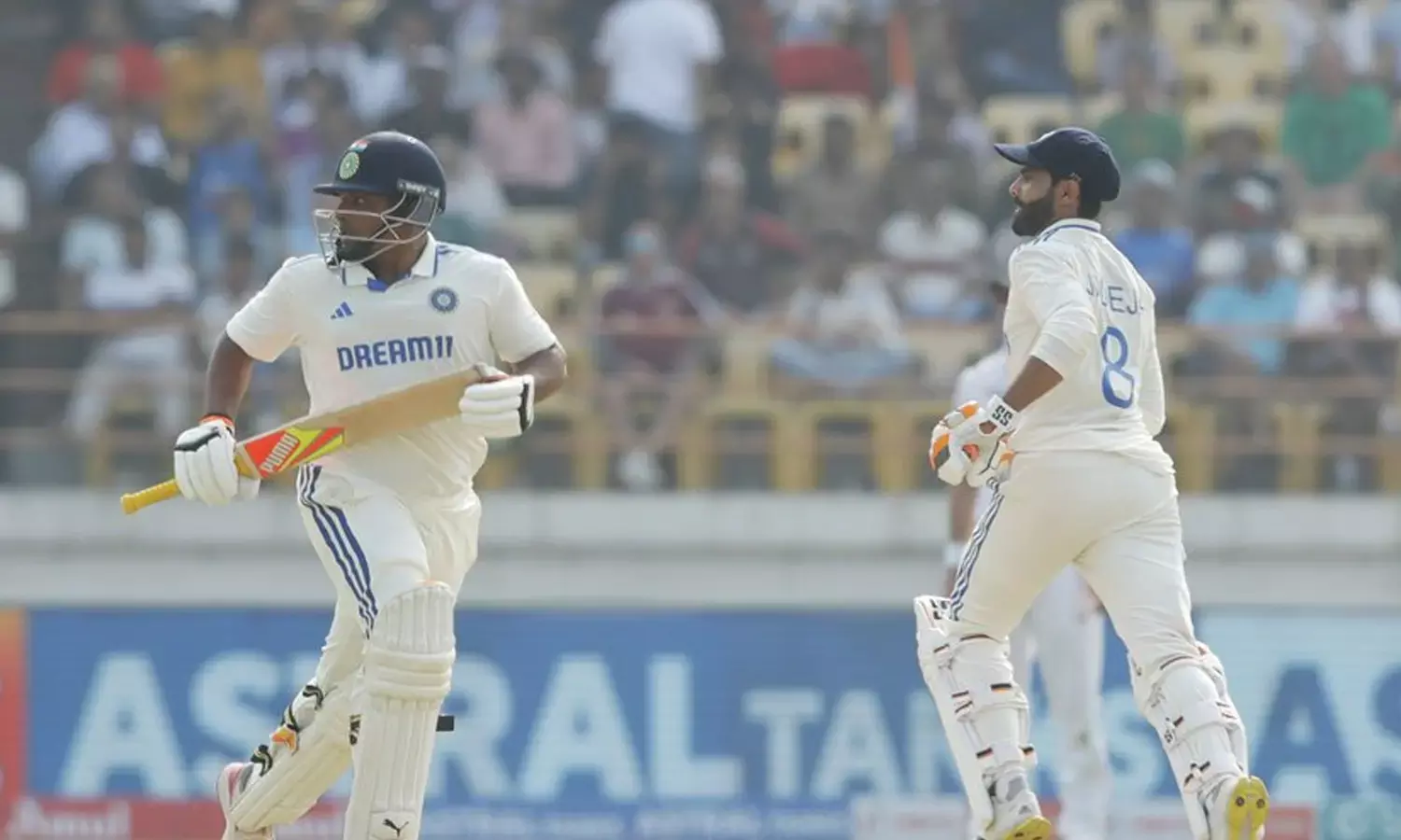 అయితే సొంత గడ్డపై ఆల్ రౌండర్ జడేజా సెంచరీ పూర్తి చేసుకున్నాడు. టెస్ట్ మ్యాచ్ లలో జడేజాకు ఇది నాల్గో సెంచరీ, 198 బంతుల్లో సెంచరీ సాధించిన జడేజా భారత్ కు భారీ స్కోరు సాధించిపెట్టడంలో కీలక భూమిక పోషించాడు. దీంతో పాటు తొలి అంతర్జాతీయ మ్యాచ్ లో అరగ్రేటం చేసిన సర్ఫరాజ్ ఖాన్ అర్ధ సెంచరీ చేశాడు. తర్వాత ఒక పరుగు చేసి రనౌట్ అయ్యాడు. అత్యంత వేగంగా సర్ఫరాజ్ ఖాన్ అర్థశతకాన్ని సాధించాడు. కెప్టెన్ రోహిత్ శర్మ కూడా 131 పరుగులు చేసి భారత్ అత్యధిక పరుగులు చేయడానికి దోహదపడ్డాడు.