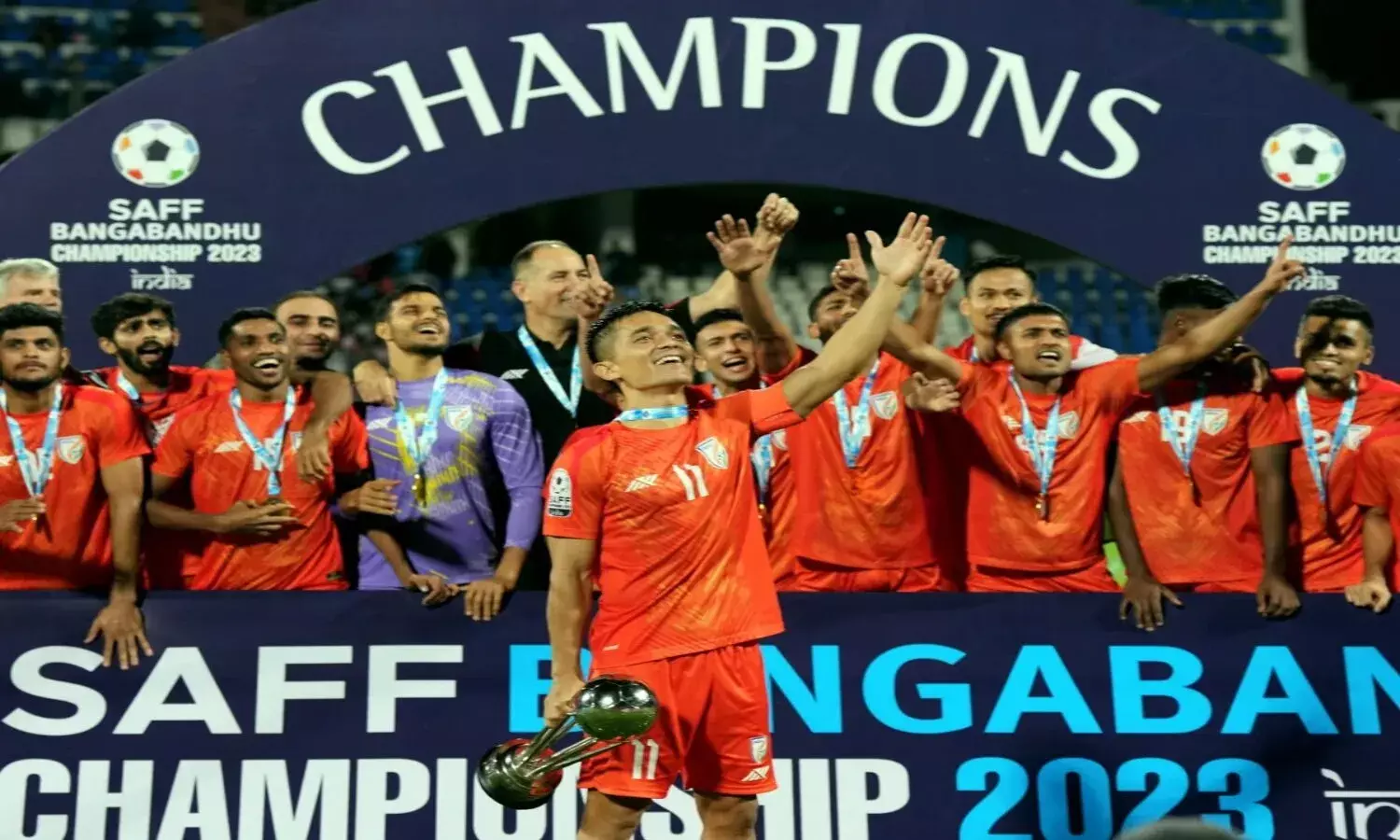 భారత ఫుట్ బాల్ జట్టు మరో టైటిల్ ను సొంతం చేసుకుంది. 9వ సారి సాఫ్ ఛాంపియన్షిప్ టైటిల్ను కైవసం చేసుకుంది. సునీల్ ఛెత్రీ సారథ్యంలోని టీమిండియా జట్టు ఉత్కంఠభరితంగా జరిగిన ఫైనల్ మ్యాచ్ లో కువైట్ను ఓడించి టైటిల్ ను ముద్దాడింది. నిర్ణీత సమయం ముగిసే వరకూ భారత్, కువైట్ జట్లు ఒక్కో గోల్ చేయడంతో మ్యాచ్ 1-1తో డ్రా అయింది. నిర్ణయాత్మక పెనాల్టీ షూటౌట్ లో భారత్ ఎటువంటి తప్పిదం చేయలేదు. ఉత్కంఠ భరితంగా సాగిన పెనాల్టీ షూటౌట్ లో భారత్ 5-4తో కువైట్ను ఓడించింది. భారత్ గతంలో 1993, 1997, 1999, 2005, 2009, 2011, 2015, 2021 సంవత్సరాలలో విజేతగా నిలిచింది. మంగళవారం జరిగిన ఫైనల్లో విజయంతో 9వ సారి సాఫ్ ఛాంపియన్ గా అవతరించింది. ప్రధాన కోచ్ ఇగోర్ స్టిమాక్ నేతృత్వంలో భారతదేశానికి వరుసగా రెండో SAFF టైటిల్.
