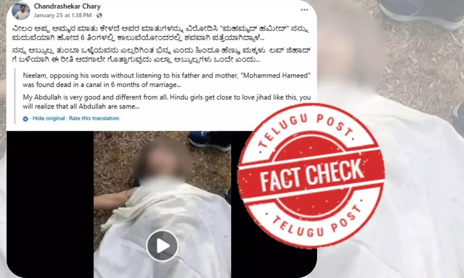 வைரலாகப் பரவிவரும் கன்னடப் பதிவில், “ನೀಲಂ ಅಪ್ಪ ಅಮ್ಮನ ಮಾತು ಕೇಳದೆ ಅವರ ಮಾತುಗಳನ್ನು ವಿರೋದಿಸಿ "ಮಹಮ್ಮದ್ ಹಮೀದ್" ನನ್ನು ಮದುವೆಯಾಗಿ ಹೋದ 6 ತಿಂಗಳಲ್ಲಿ ಕಾಲುವೆಯೋಂದರಲ್ಲಿ ಶವವಾಗಿ ಪತ್ತೆಯಾಗಿದ್ದಾಳೆ...