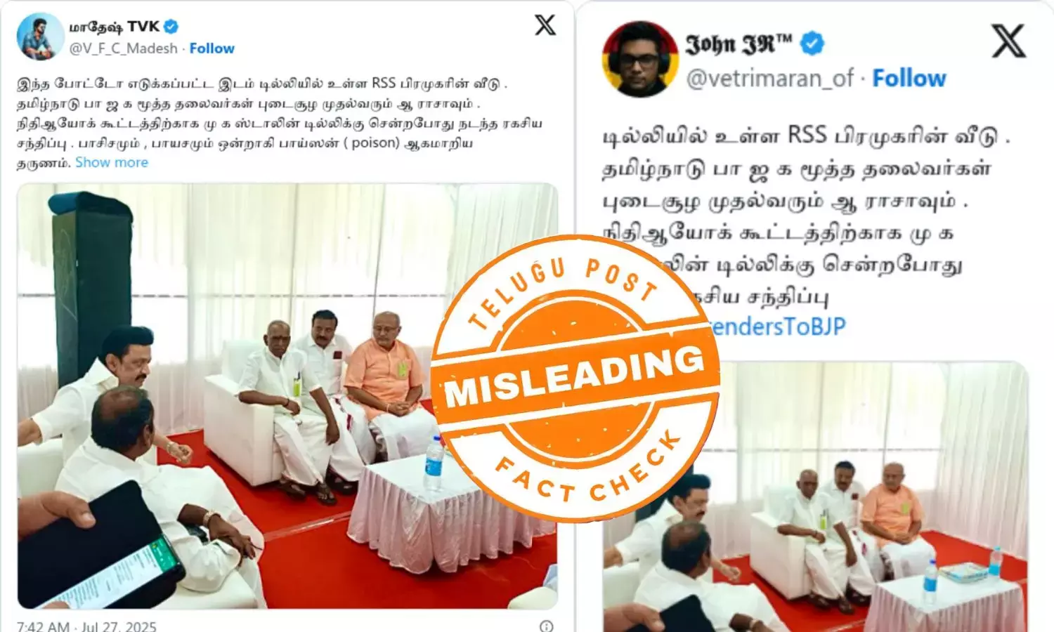 @vetrimaran_of என்ற எக்ஸ் பக்கத்தில் புகைப்படத்தைப் பகிர்ந்து, “ டில்லியில் உள்ள RSS பிரமுகரின் வீடு . தமிழ்நாடு பா ஜ க மூத்த தலைவர்கள் புடைசூழ முதல்வரும் ஆ ராசாவும் . நிதிஆயோக் கூட்டத்திற்காக மு.க.ஸ்டாலின் டெல்லிக்கு சென்றபோது நடந்த ரகசிய சந்திப்பு” என்று குறிப்பிடப்பட்டு இருந்தது.
