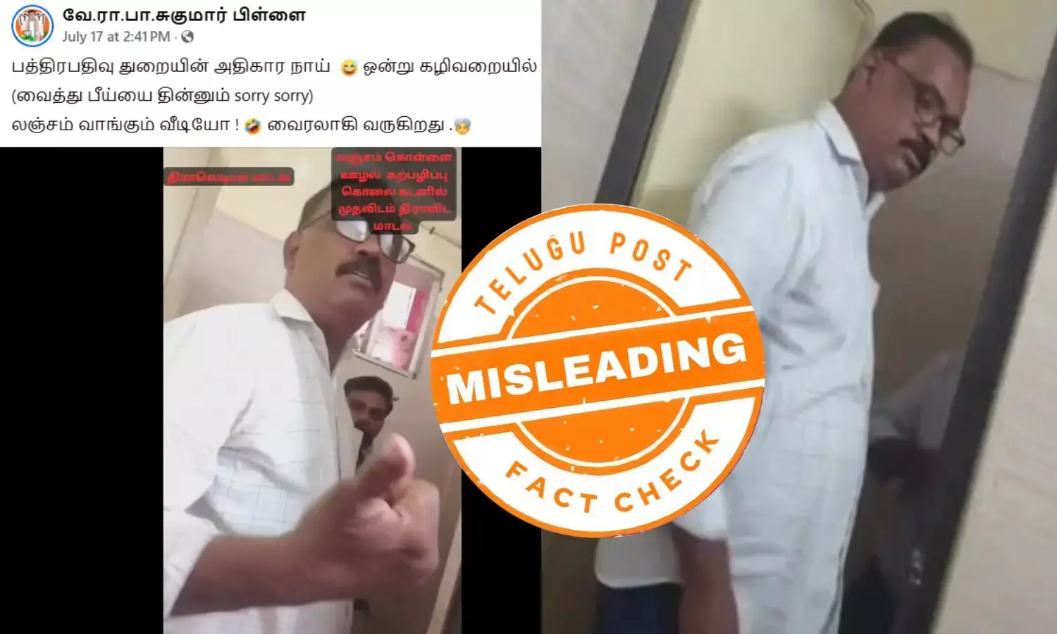 தமிழ்நாட்டில் உள்ள சார் பதிவாளர் அலுவலகத்தில் அதிகாரி லஞ்சம் வாங்கியதாக தவறான தகவலுடன் வீடியோ பரவி வருகிறது. அது நடந்தது புதுச்சேரி யூனியன் பிரதேசத்தில் என்பது உறுதிப்படுத்தப்பட்டுள்ளது. ஆகவே, செய்திகளை வெளியிடும்போது பகுப்பாய்வு செய்து வெளியிடும்படி TeluguPost உண்மை கண்டறியும் குழு கேட்டுக்கொள்கிறது.