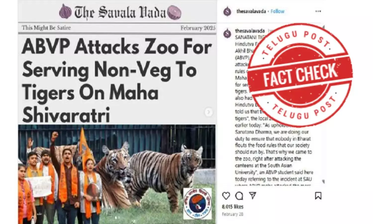 சமூக ஊடகங்களில், “The Savala Vada” என்ற பக்கத்திலிருந்து ஒரு செய்தி வைரலாக பரவி வருகிறது. அந்த செய்தியில், “சிவராத்திரி அன்று புலிகளுக்கு அசைவ உணவு வழங்கியதைக் கண்டித்து ABVP அமைப்பினர் மிருகக் காட்சி சாலையை தாக்கினர்” என்று கூறப்பட்டுள்ளது.