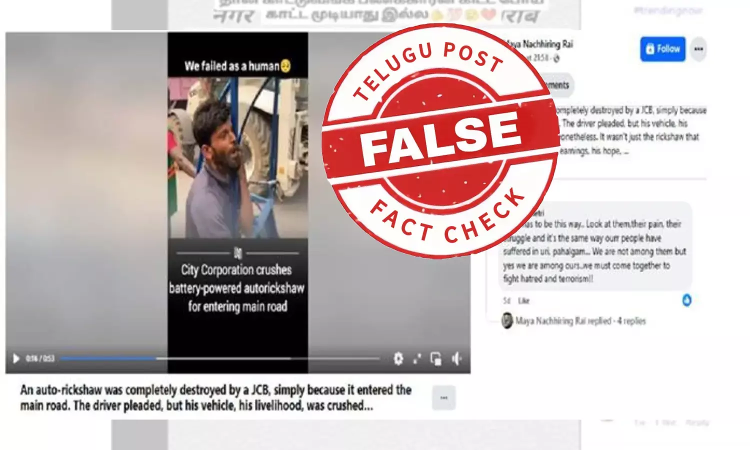 தெலுங்கு போஸ்ட் உண்மைச் சரிப்பார்ப்பு குழு இந்த காணொளியையும் அதையொட்டி பரப்பப்படும் செய்தியினையும் ஆய்வுக்கு எடுத்துக்கொண்டது. முதலாவதாக இந்த காணொளியில் காட்சியில் இருந்து முக்கியமான படங்களை மட்டும் எடுக்கப்பட்டன, அவை Google Reverse Image Search மூலம் தேடப்பட்டன. அதன் மூலம், இந்தச் செய்தியடங்கிய காட்சி ஏற்கனவே மற்ற சமூக ஊடகங்களில் பல்வேறு கருத்துக்களோடு பதிவாகியிருப்பதை கண்டறிய முடிந்தது.