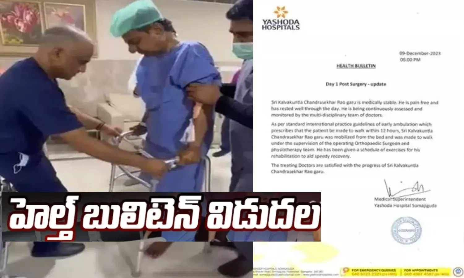 మాజీ ముఖ్యమంత్రి, బీఆర్ఎస్ అధినేత కేసీఆర్ ఆరోగ్యానికి సంబంధించిన బులెటిన్ను యశోద ఆసుపత్రి వైద్యులు విడుదల చేశారు. శనివారం సాయంత్రం ఆసుపత్రి వర్గాలు రెండో రోజు హెల్త్ బులెటిన్ను విడుదల చేశారు. కేసీఆర్ ఆరోగ్యం ప్రస్తుతం నిలకడగా ఉందని, ఆయనను వైద్య బృందం నిత్యం పర్యవేక్షిస్తోందని ఆసుపత్రి వర్గాలు వెల్లడించాయి. బెడ్ మీద నుంచి లేచి తిరుగుతున్నారని, ఆర్థోపెడిక్, ఫిజియోథెరఫీ వైద్యుల పర్యవేక్షణలో కేసీఆర్ నడుస్తున్నారన్నారు. ఆయన ఆరోగ్య పురోగతి పట్ల సంతృప్తిగా ఉన్నట్లు తెలిపారు. ఈ రోజంతా ఆయన విశ్రాంతి తీసుకున్నట్లు తెలిపారు.
