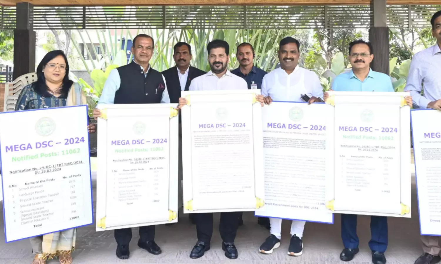 Mega DSC Notification:ఉపాధ్యాయ పోస్టుల భర్తీకి తెలంగాణ ప్రభుత్వం మెగా డీఎస్సీ నోటిఫికేషన్ జారీ చేసింది. ముఖ్యమంత్రి రేవంత్ రెడ్డి తన నివాసంలో ఈమేరకు నోటిఫికేషన్ విడుదల చేశారు. 11,062 పోస్టులతో జారీ అయిన ఈ నోటిఫికేషన్ లో స్కూల్ అసిస్టెంట్ పోస్టులు 2,629 ఉండగా, ఎస్జీటీ పోస్టులు 6,508 ఖాళీలు ఉన్నాయి. భాషా పండితులు 727, పీఈటీలు 182 పోస్టులను భర్తీ చేయనున్నారు. ప్రత్యేక కేటగిరీలో స్కూల్ అసిస్టెంట్లు 220, ఎస్జీటీలు 796 పోస్టులు ఉన్నాయి.