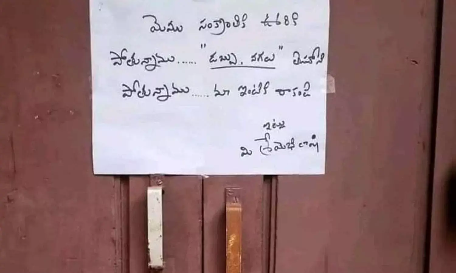 అయితే ఒక ఇంటి యజమాని మాత్రం తాను ఊరికి వెళుతూ తన తలుపునకు అంటించి వెళ్లిన పోస్టర్ సోషల్ మీడియాలో వైరల్ గా మారింది. నవ్వు తెప్పిస్తుంది. తాము సంక్రాంతి పండగకు ఊరికి వెళుతున్నామని, డబ్బు, నగలు అన్నీ తమ వెంట తీసుకు వెళుతున్నామని, మా ఇంటికి రాకండి.. ఇట్లు మీ శ్రేయోభిలాషి అంటూ రాసి తాళం వేసుకుని ఊరికెళ్లాడు.