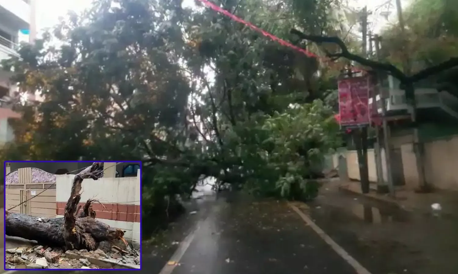 హైదరాబాద్ : బుధవారం తెల్లవారుజాము నుంచి భాగ్యనగరంలో కురిసిన భారీ వర్షం ఊహించని బీభత్సాన్ని సృష్టించింది. ఈదురు గాలుల ధాటికి భారీ వృక్షాలు నెలకొరగ్గా.. విద్యుత్ తీగలు తెగి.. చాలా ప్రాంతాల్లో విద్యుత్ సరఫరాకు అంతరాయం ఏర్పడింది. వర్షపు నీరు డ్రైనేజీల్లోకి వెళ్లే దారిలేక రోడ్లన్నీ జలమయమయ్యాయి. తలాబ్ కట్ట తెగడంతో.. డ్రైనేజ్ వాటర్ ఇళ్లలోకి చేరింది. పాతబస్తీలో వర్షపు నీరు నిలిచిపోవడంతో.. ప్రజలు తీవ్ర ఇబ్బందులు ఎదుర్కొంటున్నారు. ధాన్యం కొనుగోలు కేంద్రాల వద్ద పోసిన ధాన్యరాశి భారీ వర్షానికి తడిచిపోయింది. కొన్ని చోట్ల ధాన్యం వర్షపునీటికి కొట్టుకుపోయింది. అకాల భారీ వర్షం.. రైతుల కళ్లల్లో కన్నీటికి కారణమైంది.