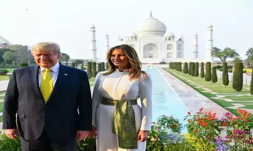 అమెరికా అధ్యక్షుడు డొనాల్డ్ ట్రంప్ దంపతులు తాజ్ మహల్ ను సందర్శిస్తున్నారు. ట్రంప్ దంపతులతో పాటు ఆయన కూతురు ఇవాంకా కుటుంబం కూడా తాజ్ మహల్ ను సందర్శించింది. ఆగ్రా చేరుకున్న ట్రంప్ దంపతులకు ఉత్తర్ ప్రదేశ్ ముఖ్యమంత్రి యోగి ఆదిత్యానాధ్ స్వాగతం పలికారు. తాజ్ మహల్ అందాలను ట్రంప్ దంపతులు వీక్షిస్తున్నారు. ప్రత్యేకంగా నియమించిన గైడ్ ట్రంప్ దంపతులకు తాజ్ మహల్ నిర్మాణం, దాని ప్రాముఖ్యతను వివరిస్తున్నారు. అక్కడ విజిటర్స్ బుక్ లో ట్రంప్ దంపతులు సంతకాలు చేశారు. ఇద్దరూ తాజ్ మహల్ వద్ద ఫొటోలు దిగారు. ప్రేమించి పెళ్లి చేసుకున్న ట్రంప్, మెలానియాలు ప్రేమకు చిహ్మమైన తాజ్ మహల్ వద్ద సాయంసంధ్యలో గడిపారు.