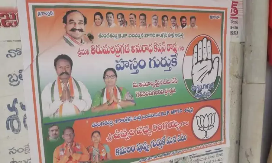 ఎన్నికల వేళ అభ్యర్థులు, పార్టీల చిత్రాలు విచిత్రంగా ఉంటాయి. ముఖ్యంగా స్థానిక సంస్థల ఎన్నికల్లో రాజకీయాలు చిత్రంగా ఉంటాయి. పార్టీలు, సిద్ధాంతాలు పక్కన పెట్టుకొని స్థానిక పరిస్థితులకు తగ్గట్లుగా పొత్తు పెట్టుకుంటారు. ఇటువంటి పొత్తులే తుంగతుర్తి నియోజకవర్గం పెట్టుకున్నారు. తుంగతుర్తి జెడ్పీటీసీ స్థానానికి పోటీ చేస్తున్న కాంగ్రెస్ పార్టీ అభ్యర్థికి ఏకంగా కాంగ్రెస్ అంటే ఏ మాత్రం పొసగని బీజేపీ మద్దతు ఇచ్చింది. ఇక, తుంగతుర్తి – 1 ఎంపీటీసీ స్థానానికి పోటీ చేస్తున్న బీజేపీ అభ్యర్థికి క్విడ్ ప్రో కో కింద కాంగ్రెస్ పార్టీ మద్దతు ఇచ్చింది. అంతేకాదు ఉమ్మడిగా రెండు పార్టీల పోస్టర్లు కూడా దర్శనమిస్తున్నాయి. ఈ పోస్టర్లలో కాంగ్రెస్, బీజేపీ నేతల ఫోటోలు పక్కపక్కనే ఉండటం గమనార్హం. బలంగా ఉన్న టీఆర్ఎస్ ను ఎదుర్కునేందుకు ఈ రెండు పార్టీలు ఇక్కడ పొత్తు పెట్టుకోవాల్సి వచ్చిందని తెలుస్తోంది.