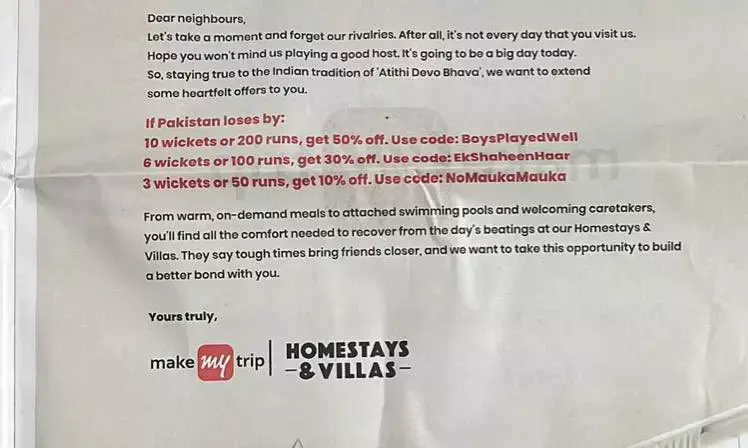 ఇండియా, పాక్ ఆడుతున్నప్పుడు... అభిమానుల అటెన్షన్ను ఆకర్షించడానికి వ్యాపార సంస్థలు కూడా పోటీ పడుతుంటాయి. ప్రముఖ ట్రావెల్ కంపెనీ ‘మేక్ మై ట్రిప్’... పాకిస్తాన్ అభిమానులకు ఓ బంపర్ ఆఫర్ ఇచ్చింది. తమ సంస్థతో ఒప్పందం కుదుర్చుకున్న హోటళ్లలో పాకిస్తాన్ అభిమానులు బస చేస్తే, వారికి హోటల్ బిల్స్ లో యాభై శాతం డిస్కౌంట్ను ప్రకటించింది. ఈ డిస్కౌంట్ వర్తించడానికి పెట్టిన కండిషన్ మాత్రం పాక్ అభిమాలుకి మింగుడు పడదు. భారత్ తో జరిగే మ్యాచ్లో పాకిస్తాన్ ఓడిపోవాలి. అదే ఆ ఆ కండిషన్. 10 వికెట్లు లేదా 200 పరుగుల తేడాతో భారత్ గెలిస్తే బిల్లులో యాభై శాతం డిస్కౌంట్ లభిస్తుంది. ఆరు లేదా అంతకంటే ఎక్కువ వికెట్లు, 100 పరుగుల తేడా అయితే ముప్పయ్ శాతం, మూడు వికెట్లు, యాభై పరుగుల తేడాతో భారత్ గెలిస్తే పది శాతం డిస్కౌంట్ అందుతుంది. ఈ అవకాశం పాకిస్తాన్ అభిమానులకు మాత్రమే సొంతం.