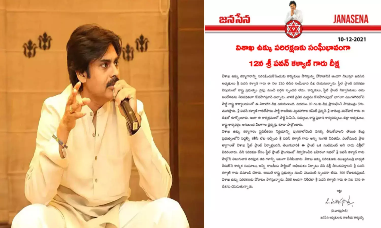 జనసేన అధినేత పవన్ కల్యాణ్ రేపు విశాఖ స్టీల్ ప్లాంట్ ప్రయివేటీకరణను నిరసిస్తూ దీక్షకు దిగనున్నారు.