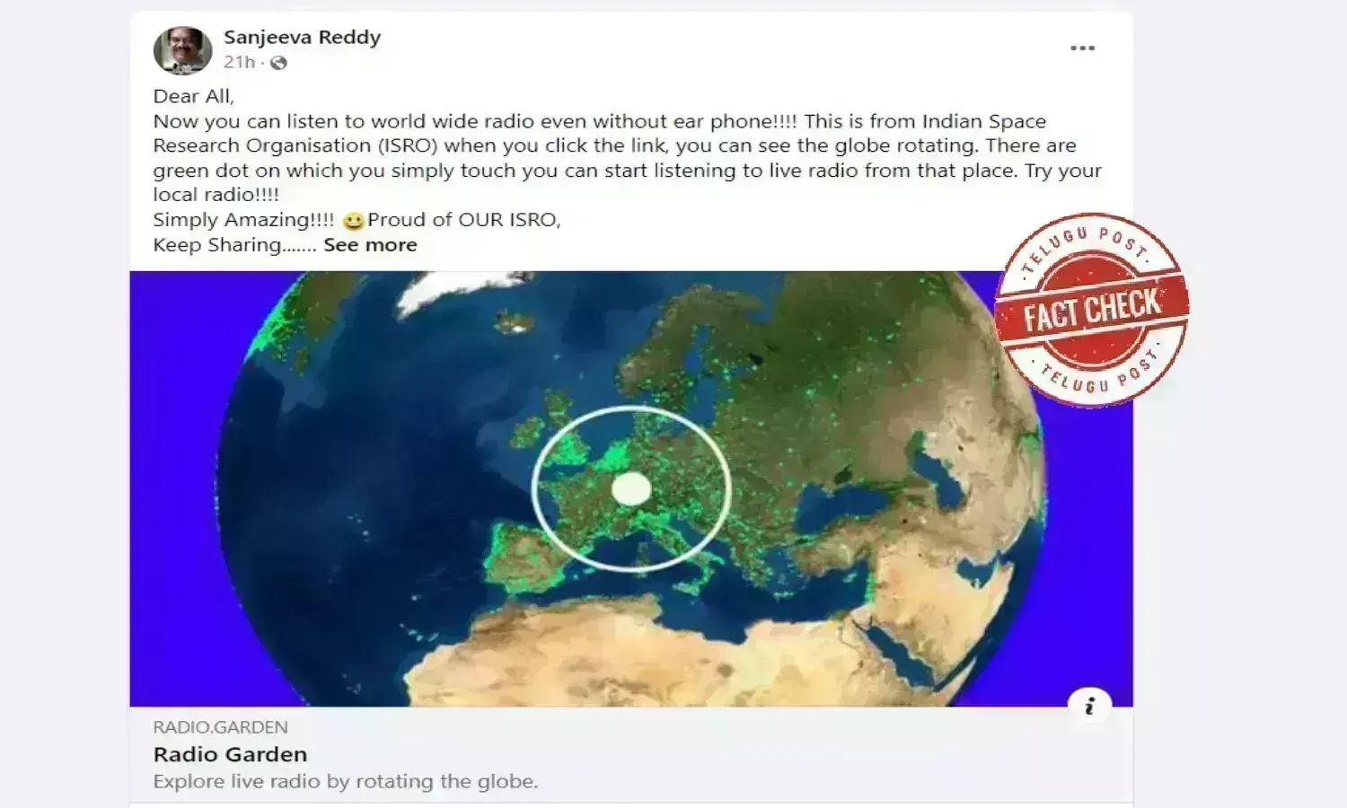 واٹس ایپ پر اور چند یوزرس کی جانب سے فیس بک پر بھی ایک میسیج ریڈیو گارڈن کو لے کر کافی وائرل ہورہا ہے جس میں دعویٰ کیا جارہا ہے کہ اسرو کی جانب سے ایک ایسا پورٹل ڈیولپ کیا گیا ہے جس کی مدد سے دنیا میں کہیں بھی لائیو ریڈیو کی سماعت کی جاسکتی ہے۔ یہ وائرل پوسٹ کچھ اس طرح ہے: ’’ ڈیئر آل، اب آپ ائرفون کے بغیر بھی دنیا بھر میں ریڈیو سن سکتے ہیں!!!! یہ انڈین اسپیس ریسرچ آرگنائزیشن (اسرو) کی طرف سے ہے جب آپ لنک پر کلک کرتے ہیں تو آپ دنیا کو گھومتے ہوئے دیکھ سکتے ہیں۔ سبز نقطے ہیں جس کو آپ صرف چھونے اس جگہ سے لائیو ریڈیو سننا شروع کر سکتے ہیں۔ اپنا مقامی ریڈیو آزمائیں!!!!
