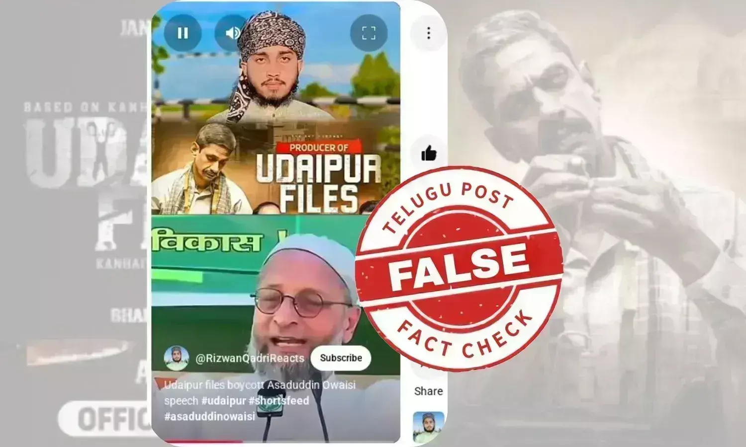 تلگو پوسٹ کی فیکٹ چیک ٹیم نے وائرل پوسٹ کی جانچ پڑتال کے بعد پایا کہ یہ دعویٰ فرضی ہے۔ اسد اویسی کے پرانے الیکشن ریلی ویڈیو کی تقریر کو کاٹ پر بغیر سیاق و سباق کے 'اودئے پور فلم' کی ریلیز سے جوڑ کر فرضی دعویٰ کیا جارہا ہے۔