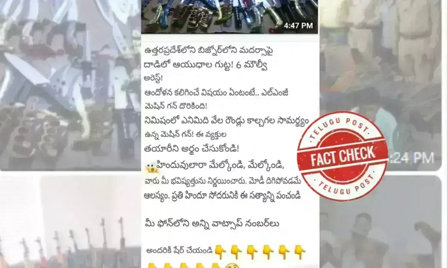 یوپی کے مدرسہ پر چھاپے کی پرانی تصویر کو اسلحہ کی غیر متعلقہ تصویروں کے ساتھ جوڑکر جھوٹی خبر پھیلائی جارہی ہے