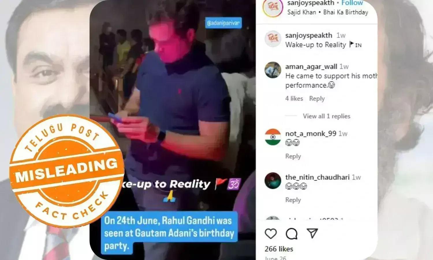 فیکٹ چیک: تلگو پوسٹ کی فیکٹ چیک ٹیم نے وائرل پوسٹ میں شامل ویڈیو کی جانچ پڑتال کے بعد پایا کہ یہ ویڈیو دراصل 2022 میں نیپال کے شہر کھٹمنڈو میں ایک پرائیویٹ پارٹی راہول گاندھی کی شرکت کا ہے، اور اس پرانے ویڈیو کو اڈانی کی سالگرہ سے جوڑکر گمراہ کن دعوے کے ساتھ دوبارہ شئیر کیا جارہا ہے۔