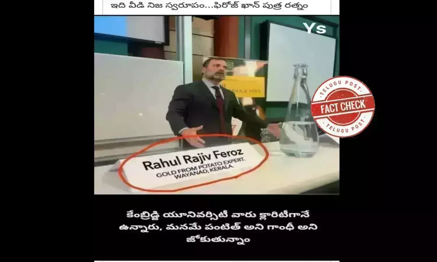 کانگریس لیڈر راہول گاندھی کی ایک تصویر جس پر نام ’راہل راجیو فیروز‘ ہے سوشل میڈیا پر گردش کر رہا ہے۔ پوسٹ میں دعویٰ کیا گیا ہے کہ جب راہول گاندھی نے کیمبرج یونیورسٹی کا دورہ کیا اور ایک تقریب میں تقریر کی تو ان کے نام کی تختی پر ’راہل راجیو فیروز، آلو سے سونا نکالنے کے ماہر، وائناد، کیرالہ‘ دکھایا گیا تھا۔