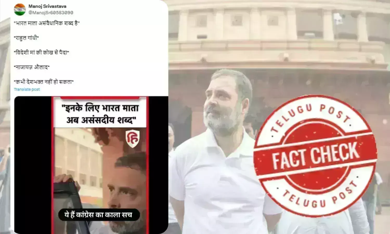 اس بیچ، راہول گاندھی کے پرانے کا ویڈیو وائرل کرتے ہوئے دعویٰ کیا جارہا ہیکہ انہوں نے کہا "انڈیا میں اب بھارت ماتا کا لفظ غیر پارلیمانی بن گیا ہے۔" سوشل میڈیا پر اس کے ساتھ یہ بھی کہا جارہا ہیکہ انہوں نے اپنے بیان سے بھارت ماتا کی توہین کی ہے