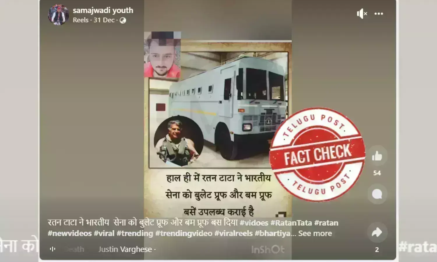سوشل میڈیا صارفین کی جانب سے ایک بڑی بس کی تصویر وائرل کرتے ہوئے دعویٰ کیا جارہا ہے کہ رتن ٹاٹا نے اس بس کا عطیہ دیا ہے۔ اس بس کی خاص بات یہ ہیکہ یہ ایک بلیٹ پروف اور بم پروف گاڑی ہے۔ اس تصویر کو ہندی میں لکھے گئے دعوے کے ساتھ شیئر کیا جارہا ہے: मशहूर उद्योगपति रतन टाटा ने भारतीय सेना को बुलेट प्रूफ और बम प्रूफ बसें उपलब्ध कराई है!”