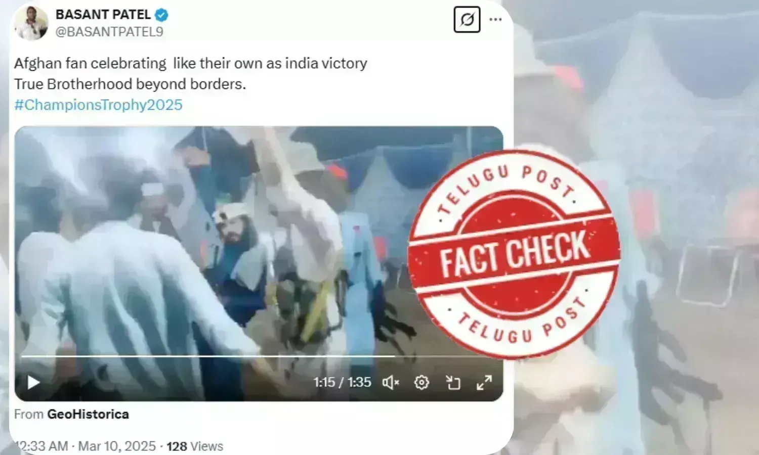 دوبئی میں نیوزی لینڈ کی ٹیم کو فائنل مقابلے میں ہراکر چئمپیئنس ٹروفی 2025 کا خطاب اپنے نام کرنے پر ٹیم انڈیا کو ملک بھر سے مبارکباد ملی اور بھارت کے ہر کونے کونے میں 9 مارچ کی رات جشن کا ماحول دیکھا گیا۔ سوشل میڈیا پر کئی صارفین نے ویڈیو کلپس شئیر کرتے ہوئے دعویٰ کیا کہ ٹیم انڈیا کی جیت کی خوشیاں افغانستان میں بھی منائی جارہی ہیں۔