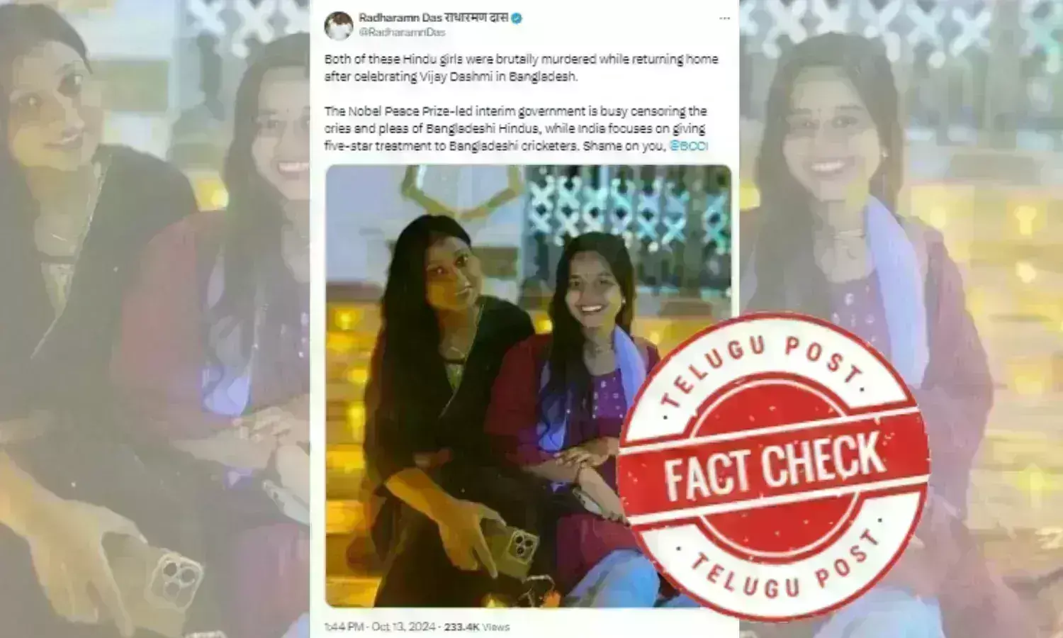 بنگلہ دیش میں مقامی اقلیتوں پر جاری حملوں کے بیچ سوشل میڈیا پر دو لڑکیوں کی ایک تصویر شیئر کرتے ہوئَے دعویٰ کیا جارہا ہیکہ پڑوسی ملک میں وجئے دشمی یعنی دسہرے کے موقع پرگھر لوٹتے وقت دو نوجوان ہندو لڑکیوں کا قتل کردیا گیا۔ ISKCON کولکاتہ کے ترجمان رادھارمن داس کے ایکس پلکیٹ فارم پر انگریزی میں کئَ گئے پوسٹ کو 2 لاکھ 33 ہزار سے زائد مرتبہ دیکھا، قریب 5 ہزار مرتبہ پسند اور 3 ہزار سےزیادہ بار شئیر کیا گیا ہے۔