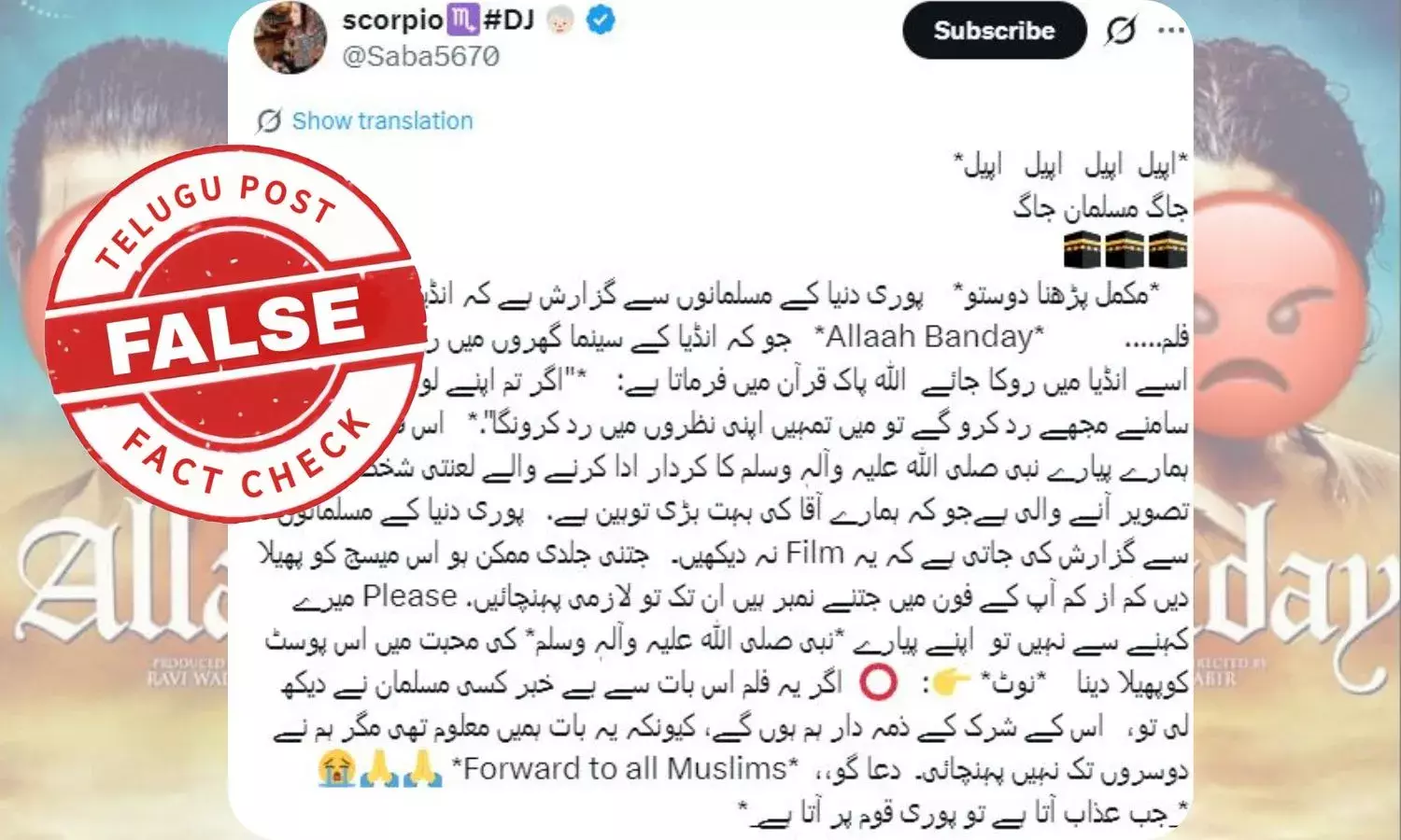 تلگو پوسٹ کی فیکٹ چیک ٹیم نے 'اللہ بندے' نامی ہندی فلم سے متعلق وائرل دعوے کی تحقیق کے بعد پایا کہ یہ دعویٰ فرضی ہے کیوں کہ بالی ووڈ فلم انڈسٹری نے پیغمبر اسلام کی حیات مبارکہ پر مبنی نہ تو ایسی کوئی فلم بنائی ہے اور نہ ہی بنانے کا اعلان کیا ہے۔