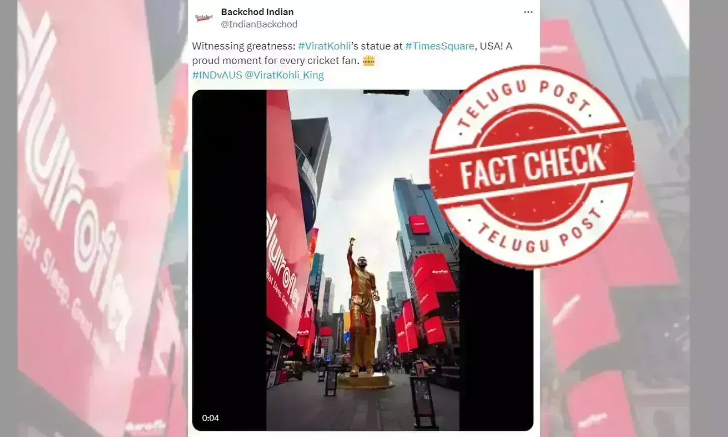 گدے کی کمپنی کے اپن انسٹاگرام اکاؤنٹ پر23 جون، 2024 کو اس ویڈیو کو شیئر کیا اور اس کے کیپشن میں لکھا تھا: "ابھی ابھی نقاب کشائی کی گئی: ٹائمز اسکوائر پر ویراٹ کوہلی کا بڑا مجسمہ نصب۔ 'دس کنگنس ڈیوٹی'، اب ہم اپن گدے عالمی سطح پر فروخت کررہے ہیں اور ایک نئی تاریخ رقم کر رہے ہیں! ویراٹ کے پسندیدہ ڈیروفلیکس میٹرس کو ہم ورلڈ کپ 2024 کے دوران نیو یارک، ویسٹ انڈیز اور دیگر جگہوں پربہم پہنچارہے ہیں! #ViratSleepsOnDuroflex. *CGI video #GreatSleepGreatHealth #ViratKohli #worldcup #cricket #CGI #cgianimation