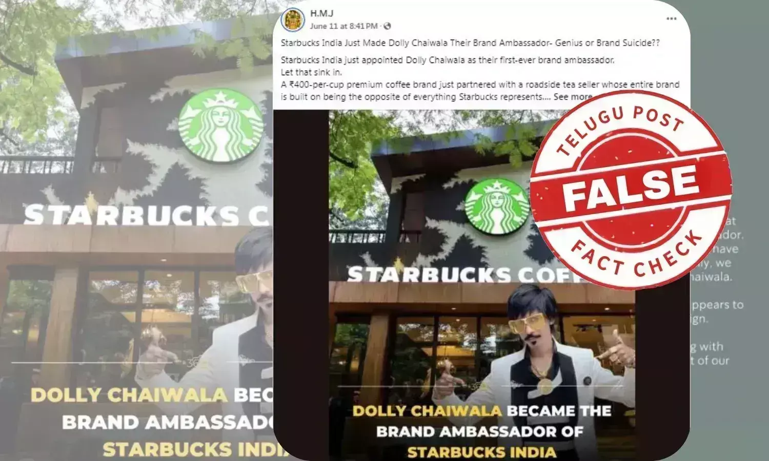 تلگو پوسٹ کی فیکٹ چیک ٹیم نے وائرل پوسٹ میں کئے گئے دعوے کی جانچ پڑتال کے بعد پایا کہ اسٹاربکس انڈیا نے ڈولی چائے والا کو اپنا برانڈ امبیسیڈر بنانے کی وائرل خبروں کی تردید کی ہے۔