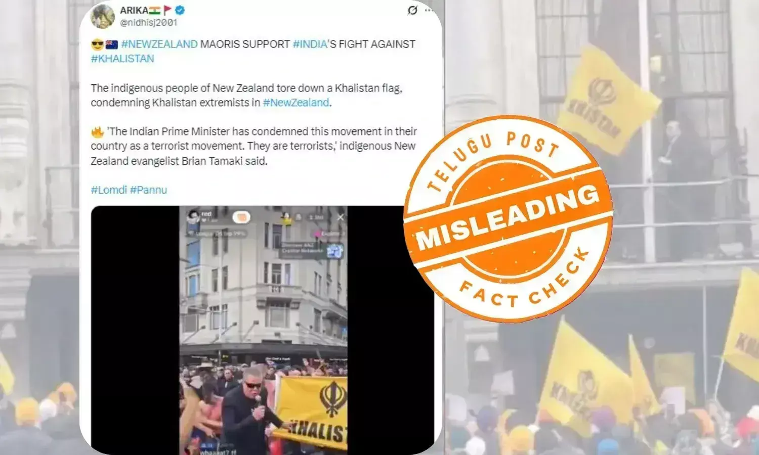تلگو پوسٹ کی فیکٹ چیک ٹیم نے وائرل پوسٹ میں کئے گئے دعوے کی جانچ پڑتال کے بعد پایا کہ ویڈیو میں ماوری احتجاجیوں کی جانب سے صرف خالصتانی تحریک کا پرچم پھاڑے جانے کی خبر گمراہ کن ہے۔ مظاہرین کا مطالبہ ہیکہ نیوزی لینڈ میں کسی بھی غیر ملکی مذہب کا پرچم نہیں لہرایا جانا چاہئے۔ تحقیق سے پتہ چلا کہ ویڈیو میں صرف خالصتان ہی نہیں بلکہ کئی مذاہب کے جھنڈے پھاڑے گئے۔