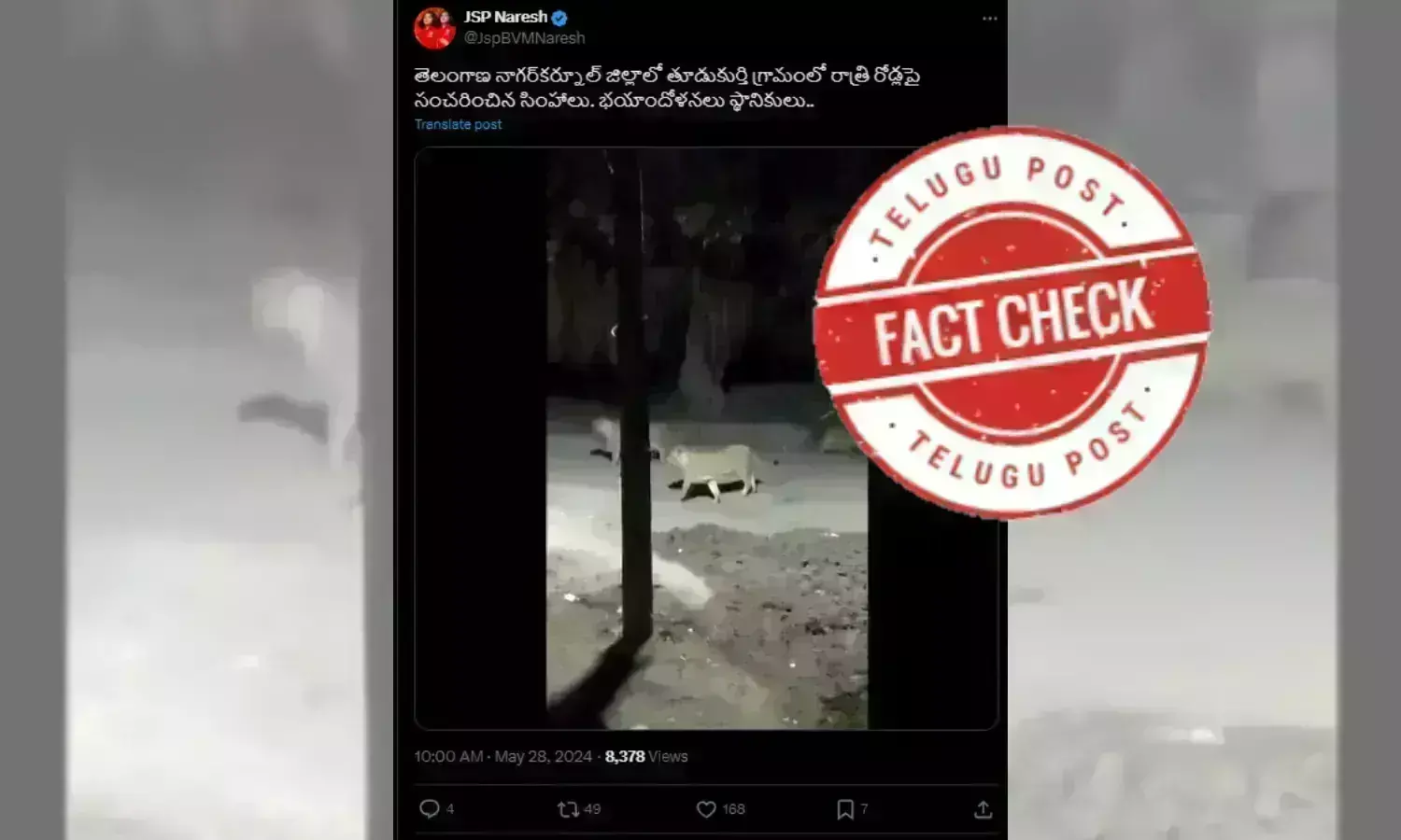 سڑک پر گھومتے شیروں کا ایک ویڈیو سوشل میڈیا پر گردش کر رہا ہے جس میں دعویٰ کیا گیا ہے کہ ان خون خوار جانورو٘ں کو تلنگانہ کے ناگرکرنول ضلع کے تھوڈوکورتی گاؤں میں دیکھا گیا۔