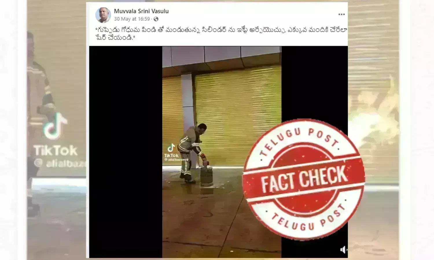 حالیہ دنوں میں وشل میڈیا پلیٹ فارمز پر ایک ویڈیو گردش کر رہا ہے جس میں ایک شخص گیس سلنڈر پر آٹا پھینک کر آگ بجھانے کا مظاہرہ کررہا ہے۔ بالخصوص واٹس ایپ پر یہ دعویٰ کہ مٹھی بھر آٹا کیسے گیس سلینڈر دھماکہ کو ہونے سے روک سکتا ہے بڑے پیمانے پرشئیر کیا جارہا ہے۔ تیلگو میں دعویٰ کا متن ہے గుప్పెడు గోధుమ పిండి తో మండుతున్న సిలిండర్ ను ఇట్టే అర్పేయొచ్చు, ఎక్కువ మందికి చేరేలా షేర్ చేయండి