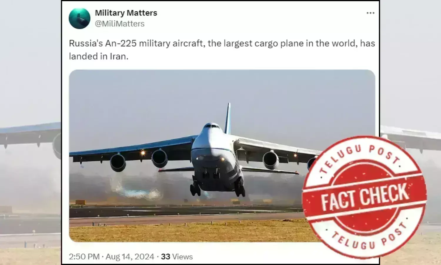 اس بیچ، اثنا سوشل میڈیا پلیٹ فارمز خاص طور پر ایکس (ٹویٹر) پر ایک طیارے کی تصویر اس دعوے کے ساتھ شیئر کی جارہی ہے کہ اس میں روس کا اے این 225 فوجی طیارہ، جو دنیا کا سب سے بڑا کارگو طیارہ ہے، ایران میں لینڈ ہوا ہے۔ روس اور ایران کے درمیان بڑھتے ہوئے روابط کی قیاس آرائیوں کے درمیان یہ پوسٹ کیا گیا ہے۔